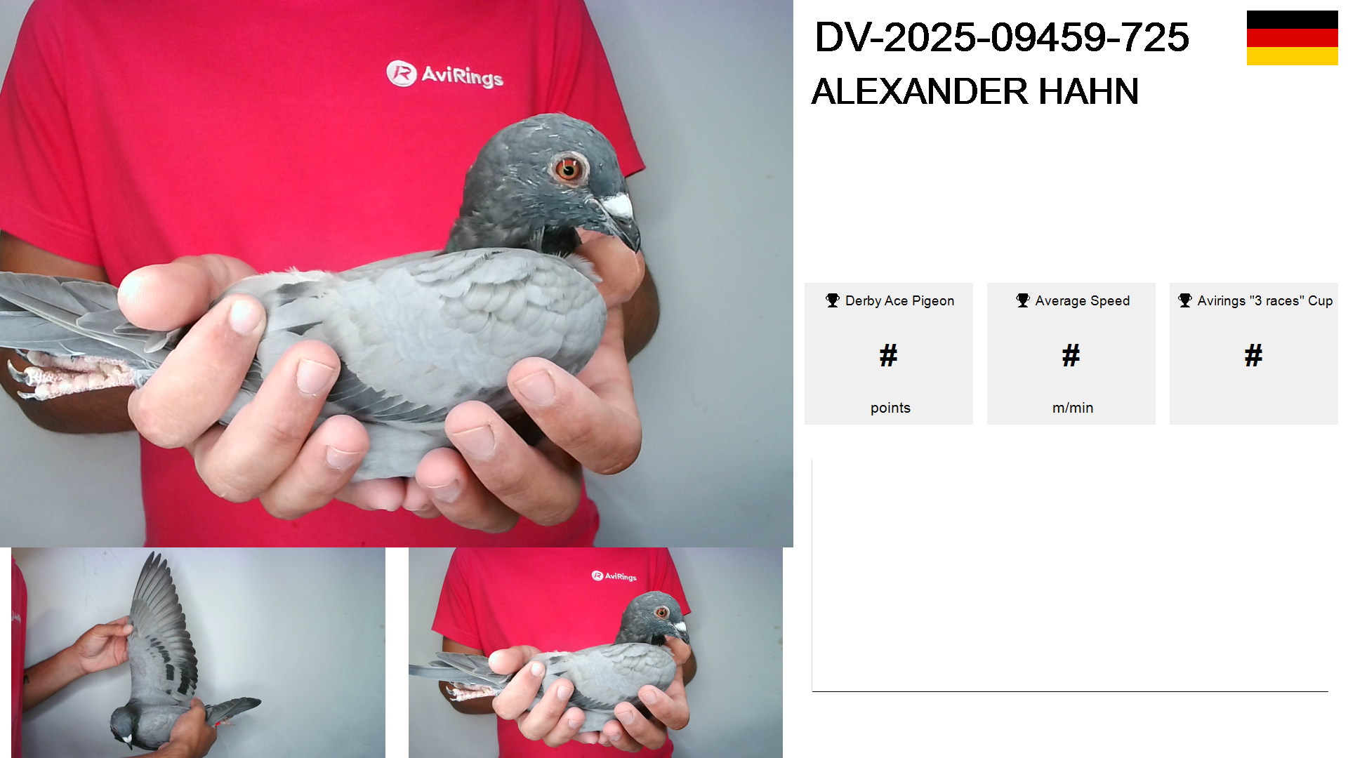 | Race | Position | Number of pigeons | Percent | Speed | Distance |