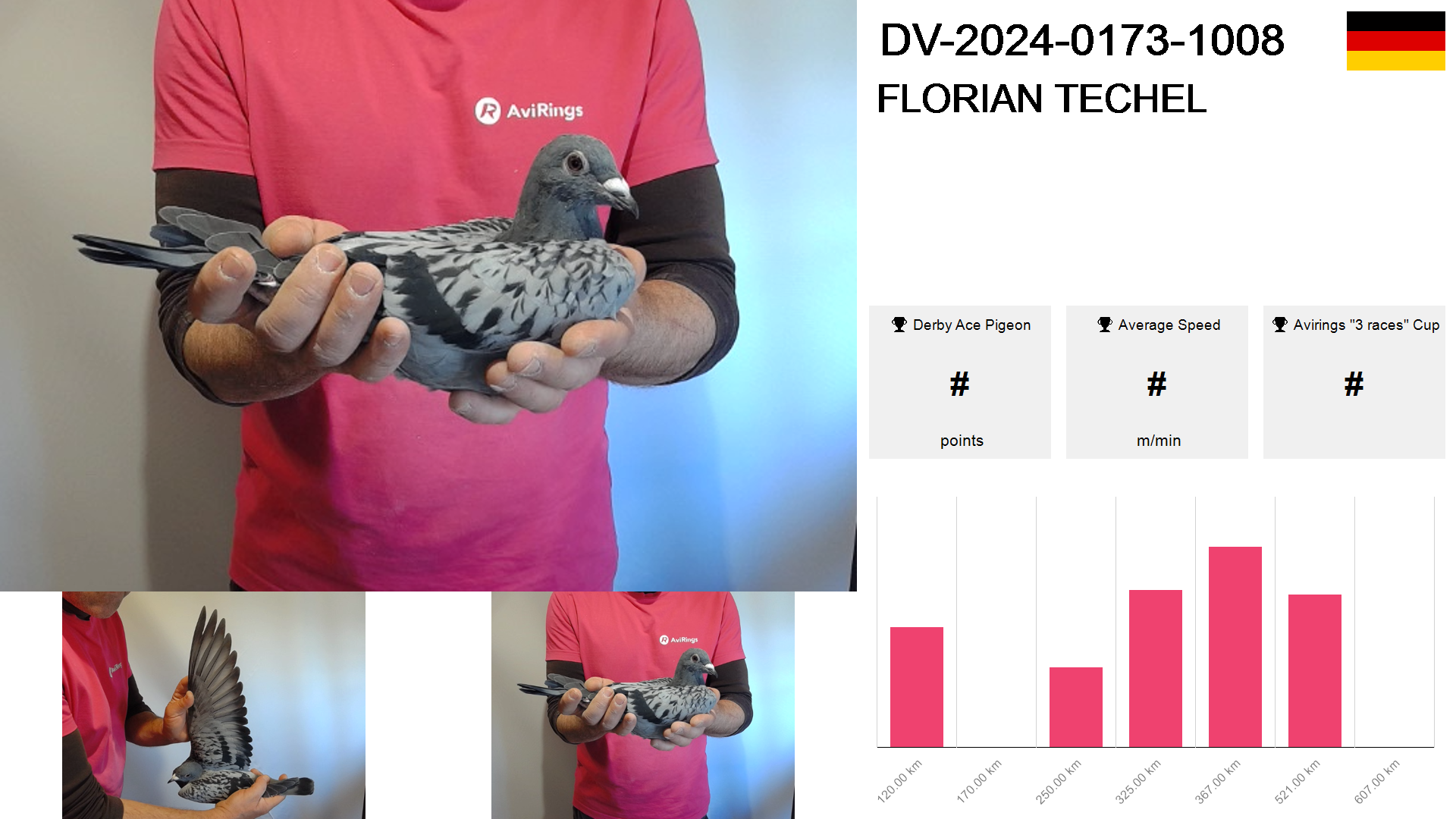 | Race | Position | Number of pigeons | Percent | Speed | Distance |