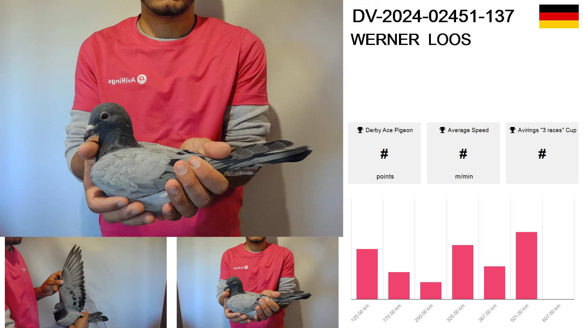 | Race | Position | Number of pigeons | Percent | Speed | Distance |