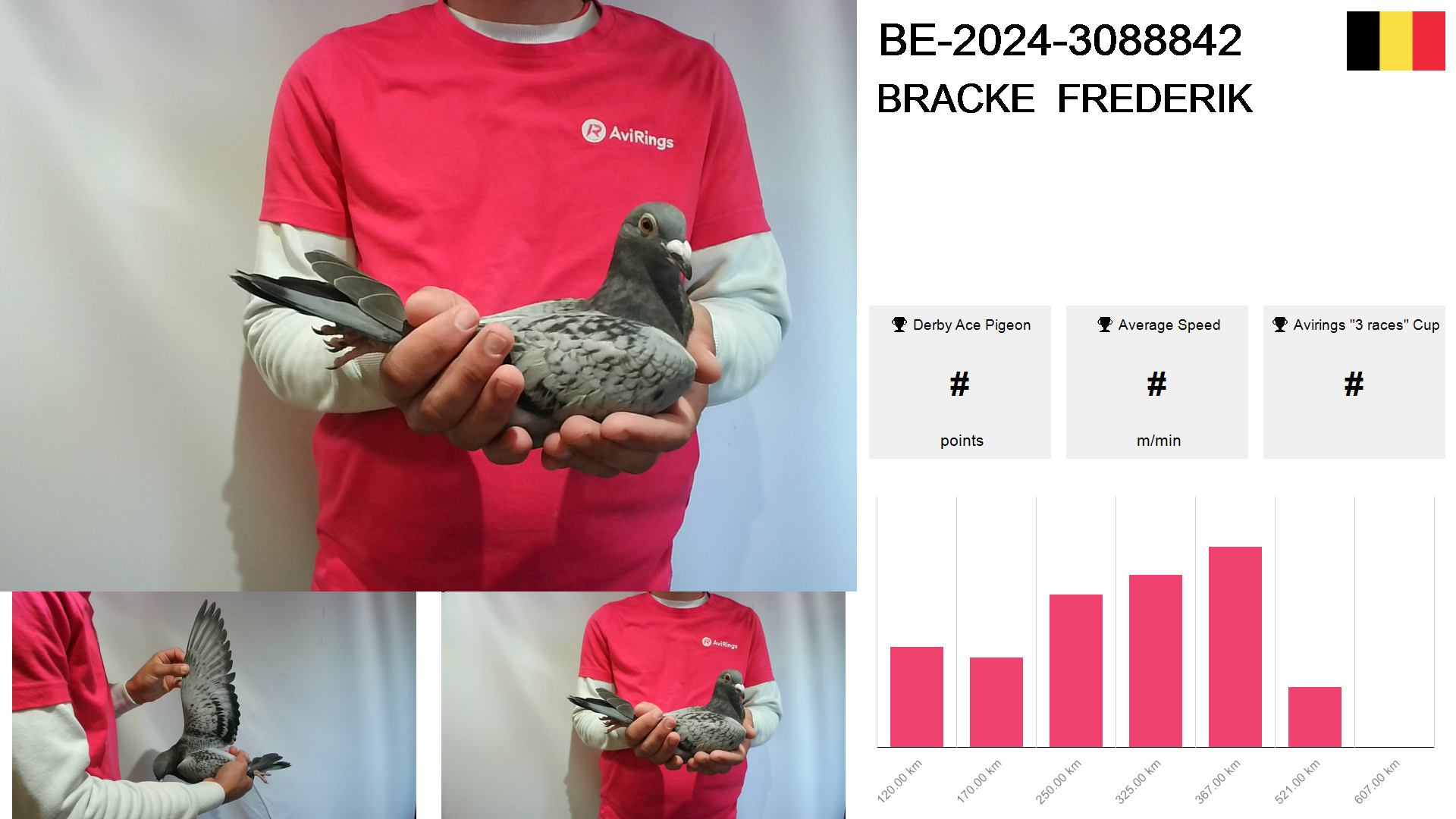 | Race | Position | Number of pigeons | Percent | Speed | Distance |