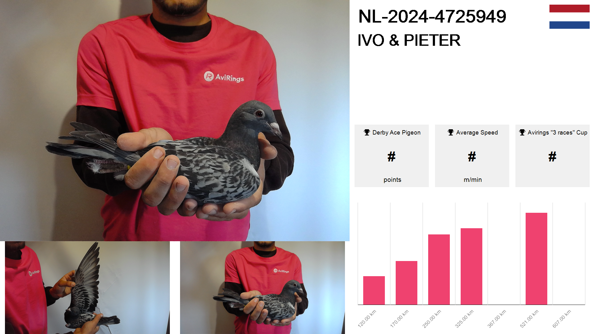 | Race | Position | Number of pigeons | Percent | Speed | Distance |