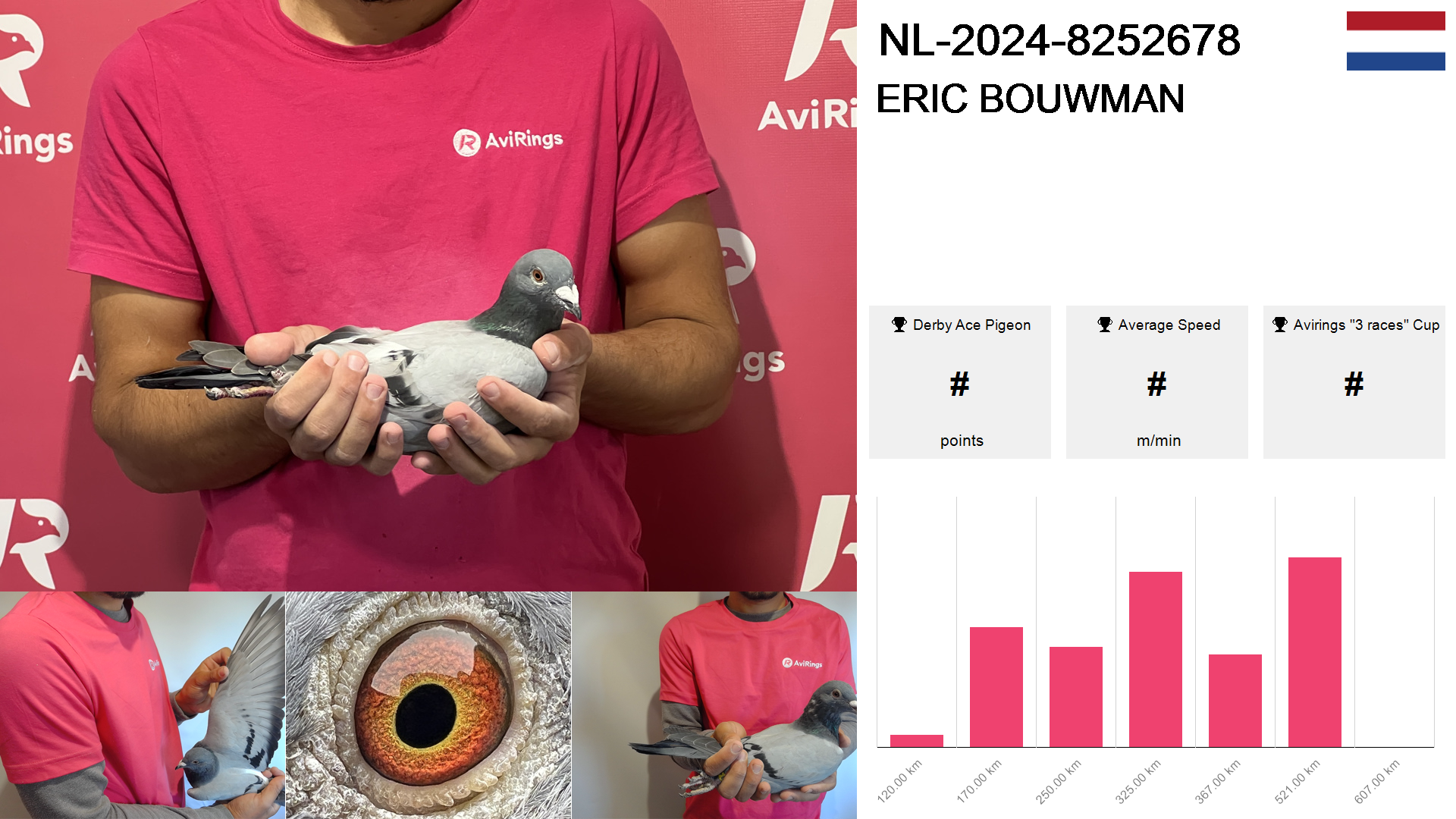 | Race | Position | Number of pigeons | Percent | Speed | Distance |