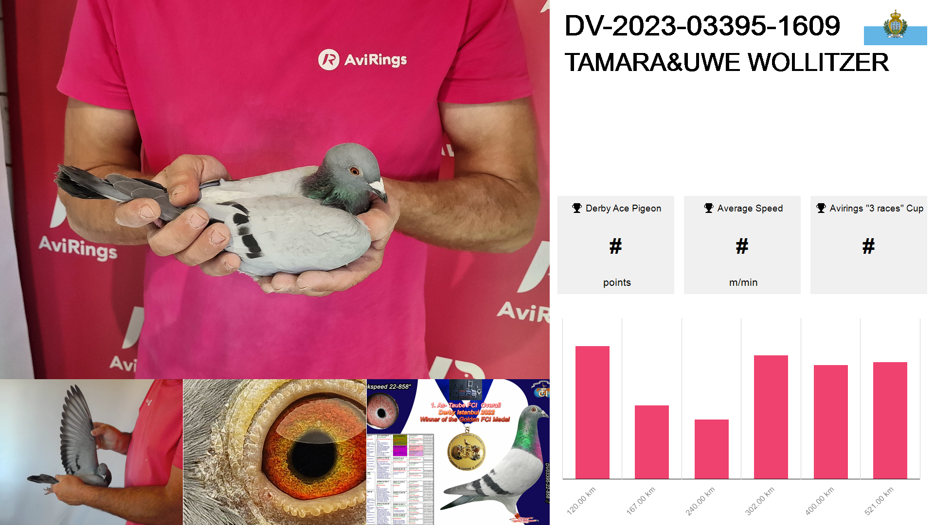 | Race | Position | Number of pigeons | Percent | Speed | Distance |