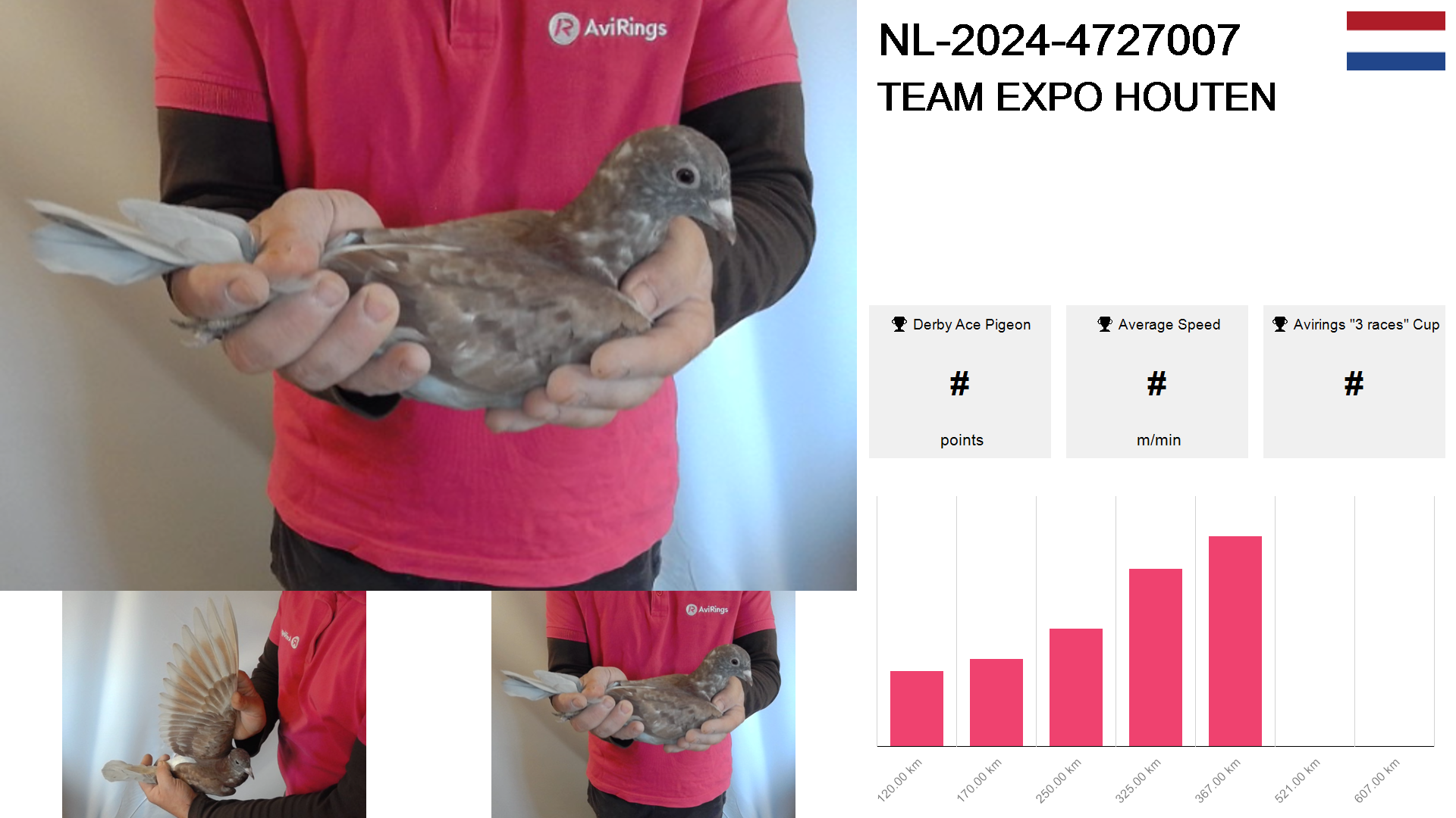| Race | Position | Number of pigeons | Percent | Speed | Distance |