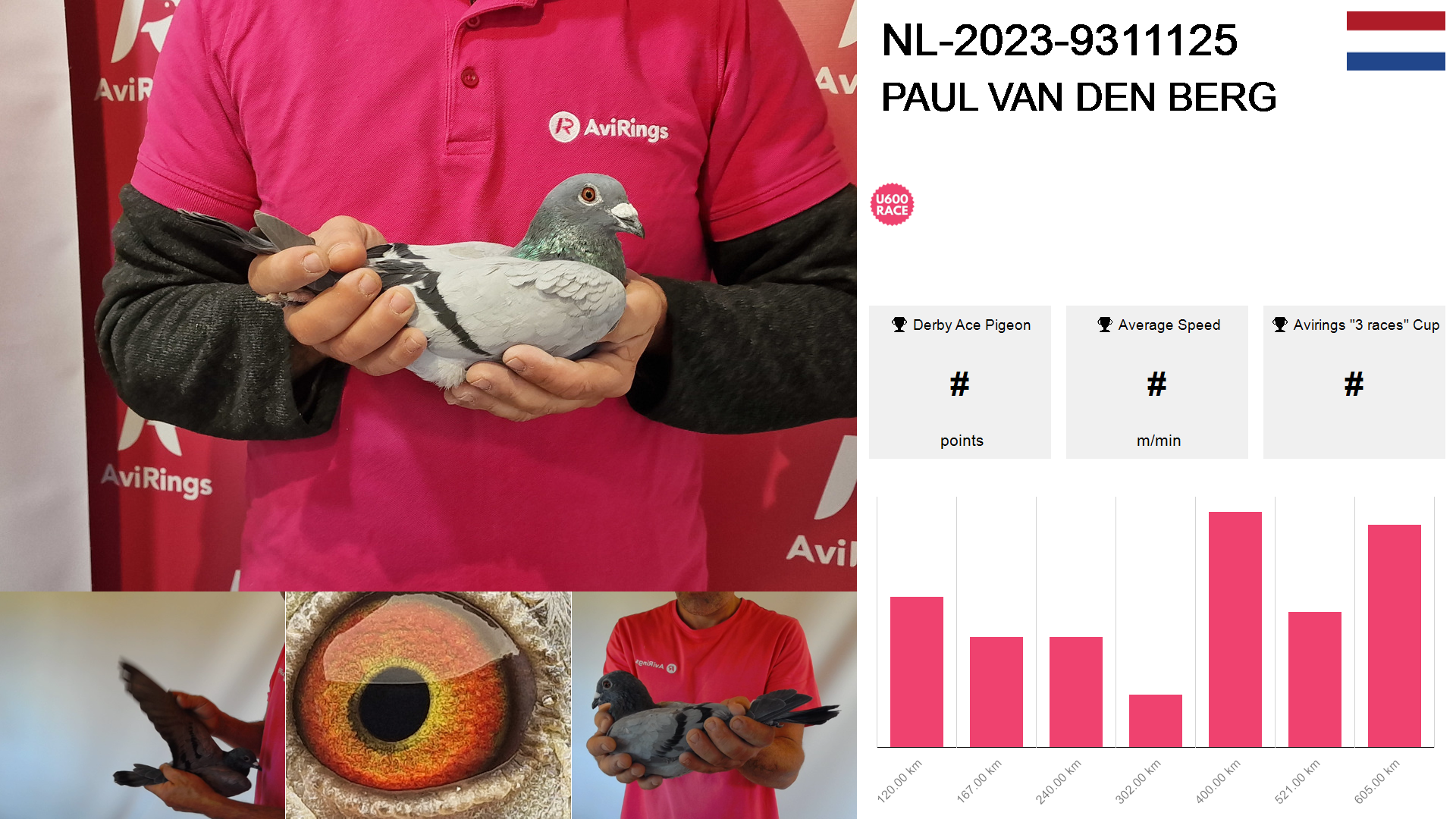 | Race | Position | Number of pigeons | Percent | Speed | Distance |