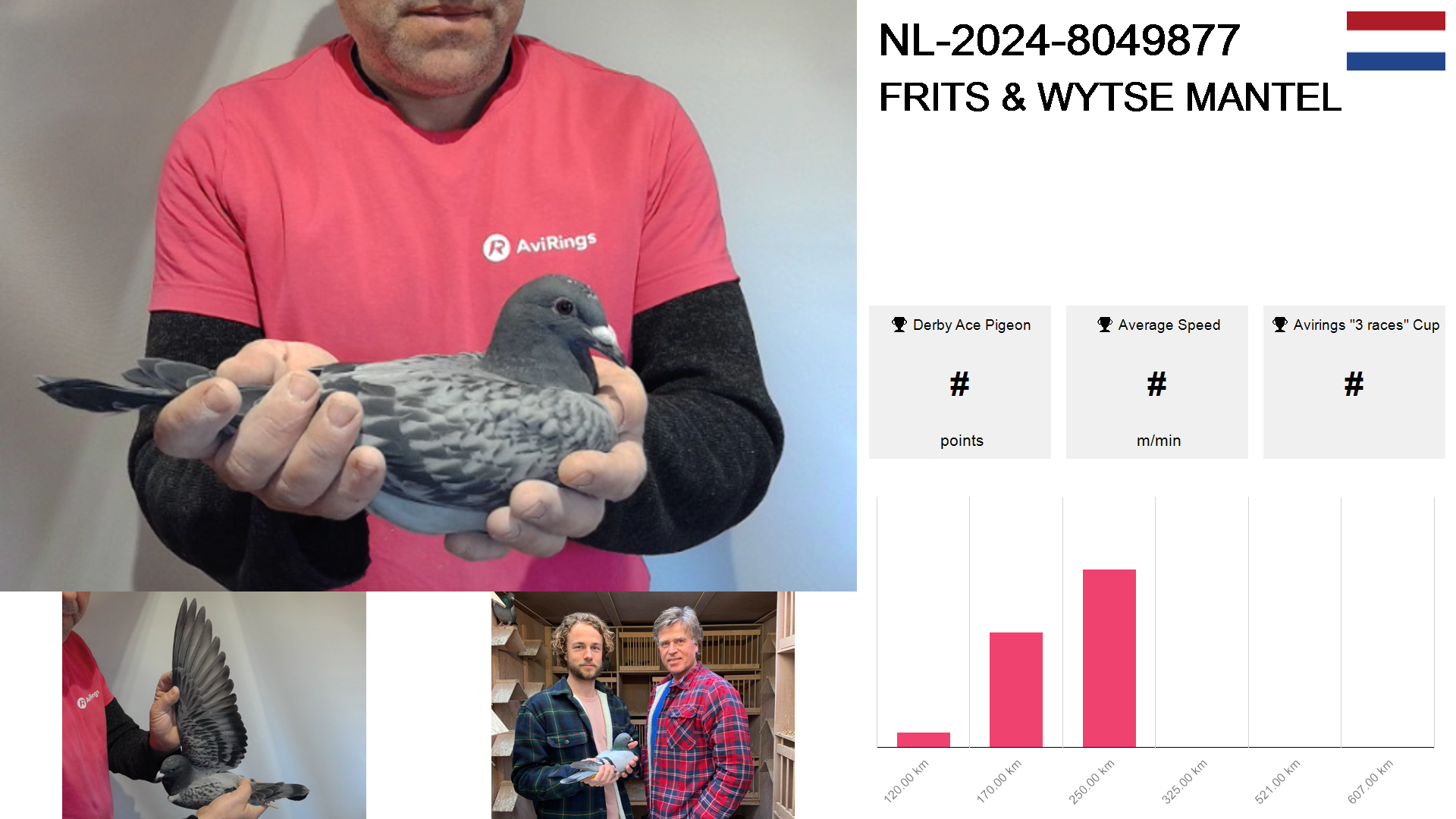 | Race | Position | Number of pigeons | Percent | Speed | Distance |