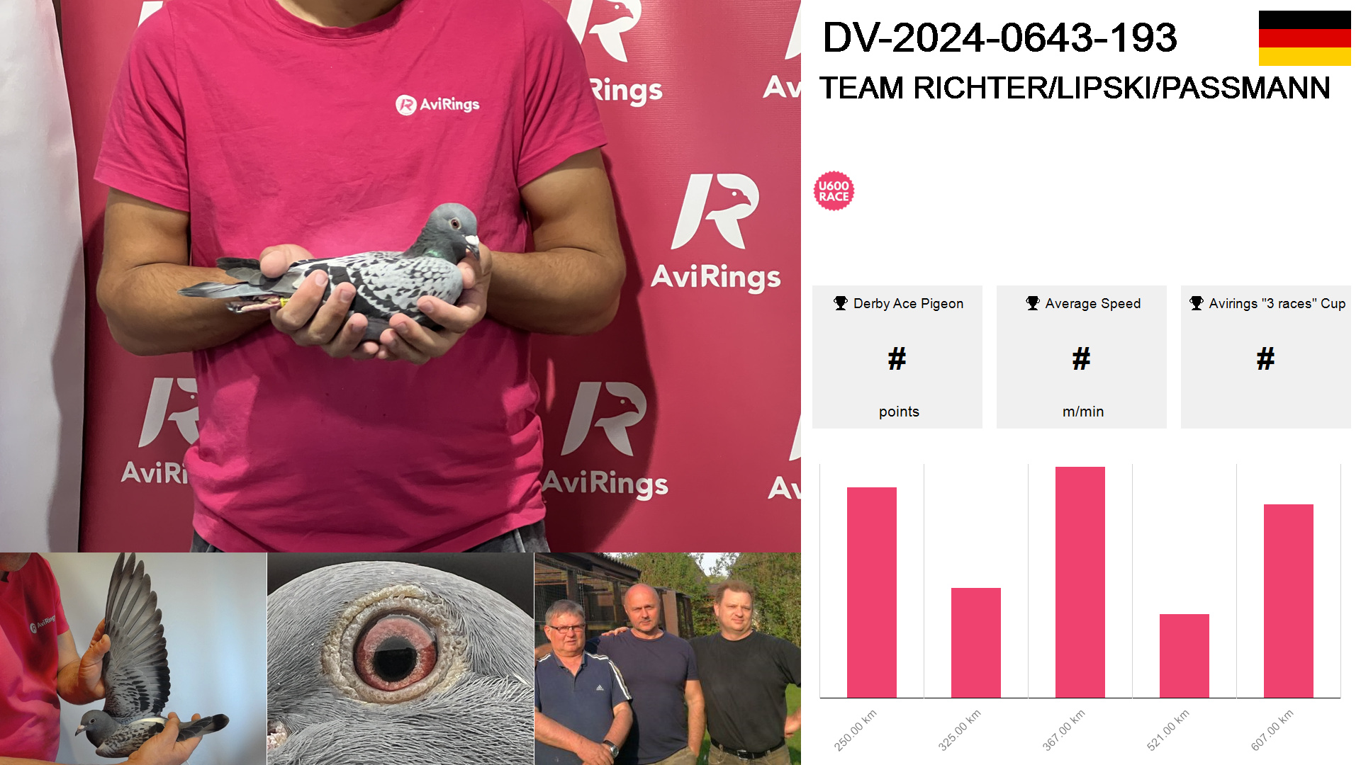 | Race | Position | Number of pigeons | Percent | Speed | Distance |