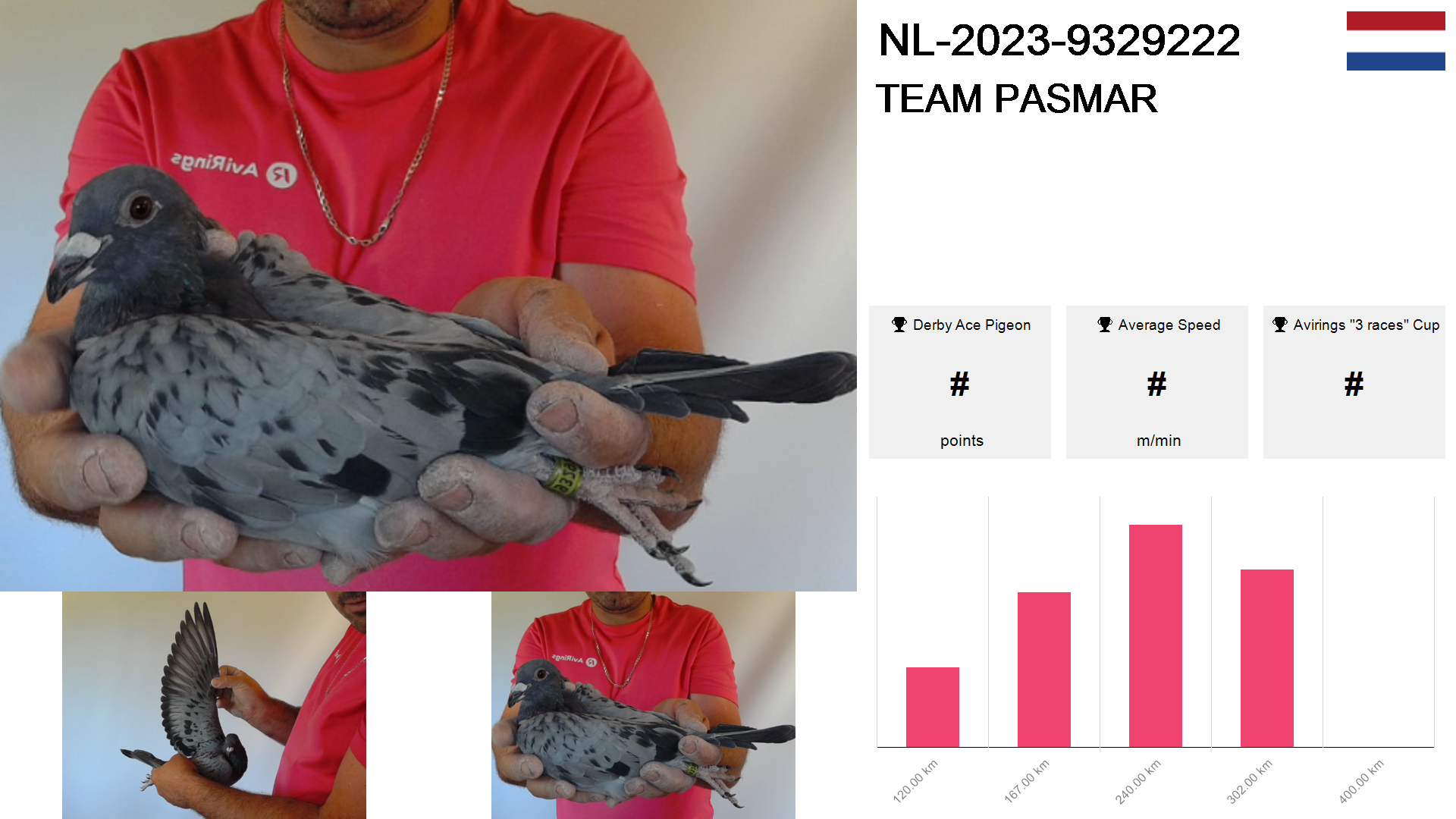 | Race | Position | Number of pigeons | Percent | Speed | Distance |