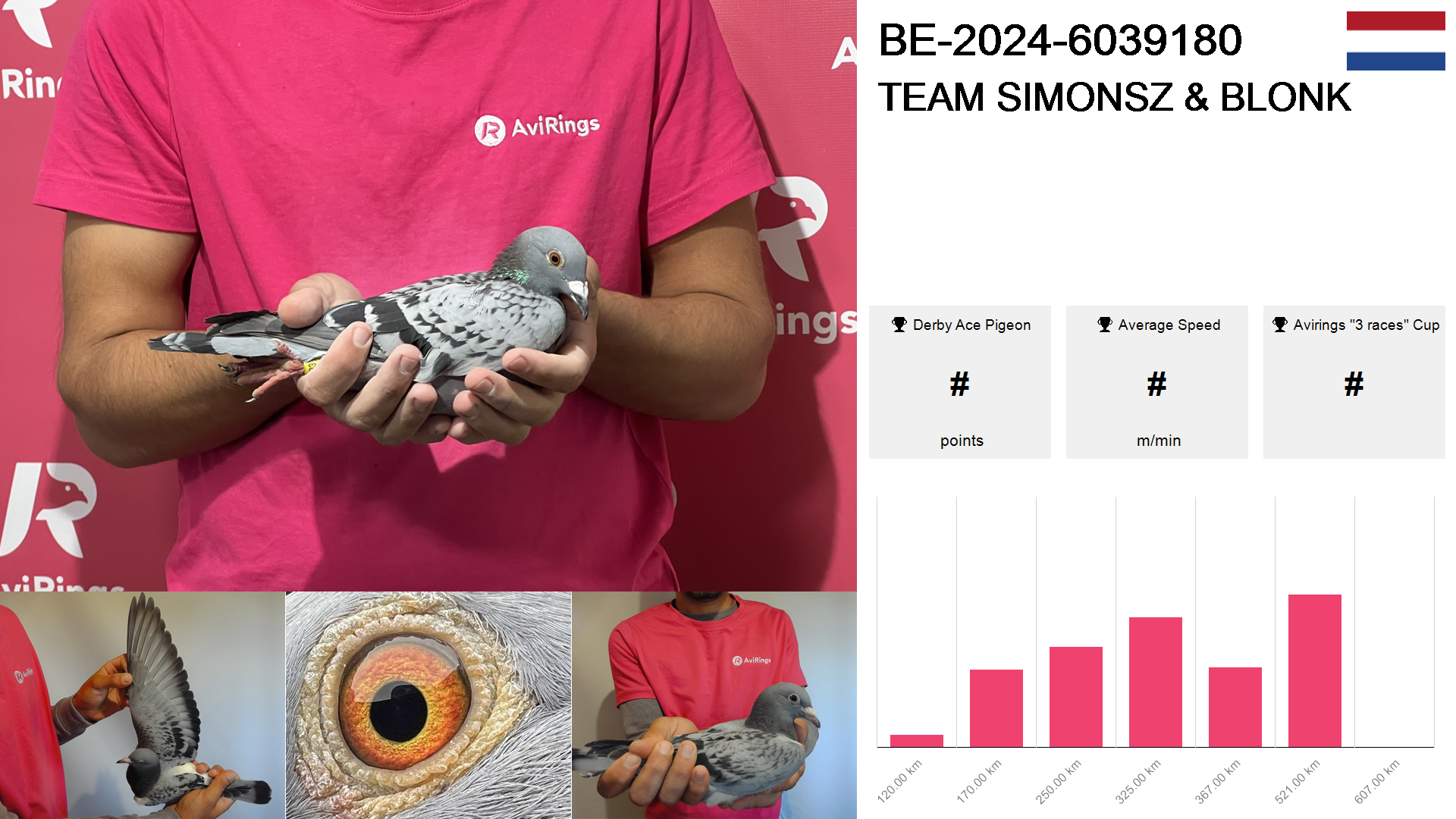 | Race | Position | Number of pigeons | Percent | Speed | Distance |