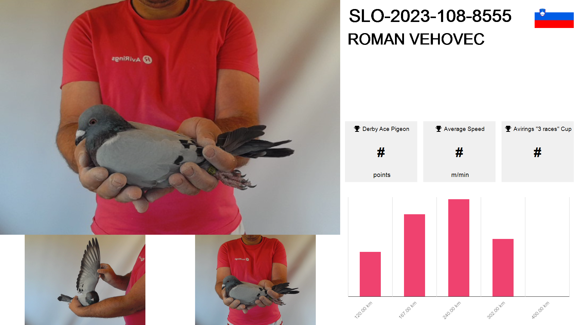 | Race | Position | Number of pigeons | Percent | Speed | Distance |
