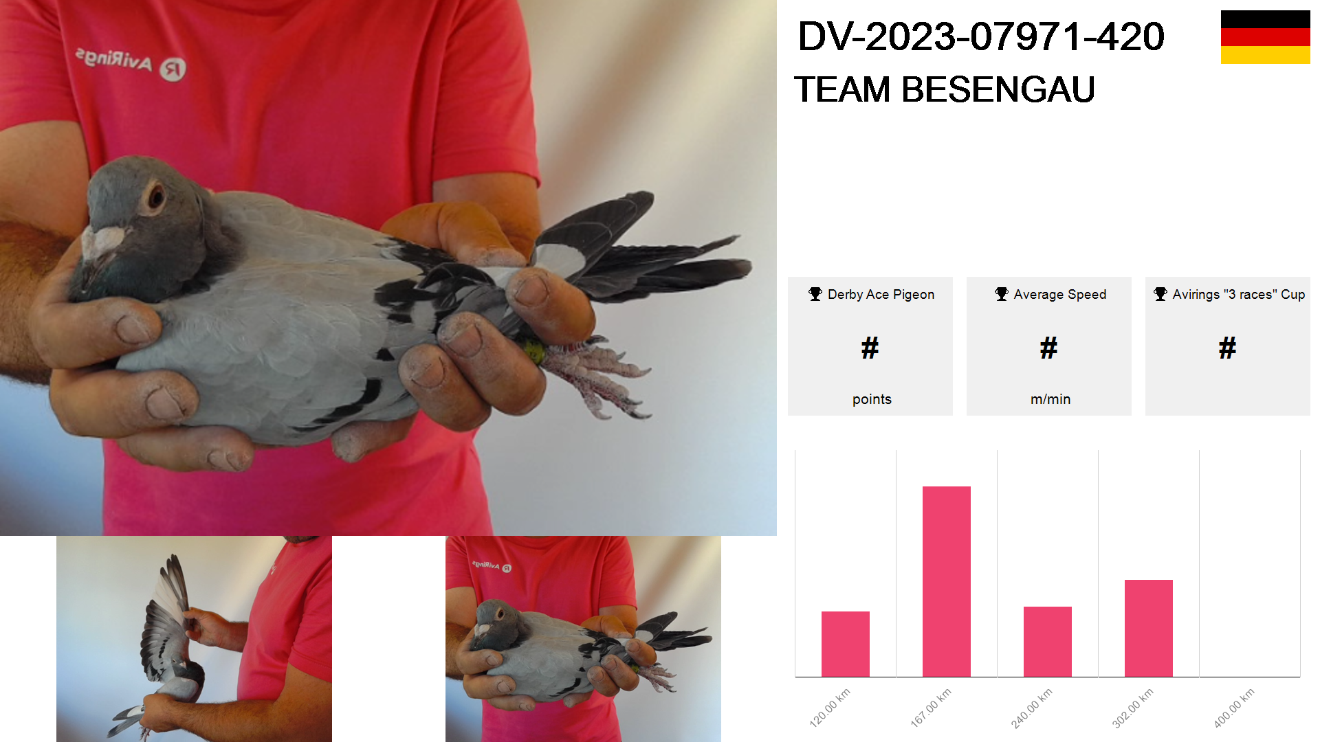 | Race | Position | Number of pigeons | Percent | Speed | Distance |