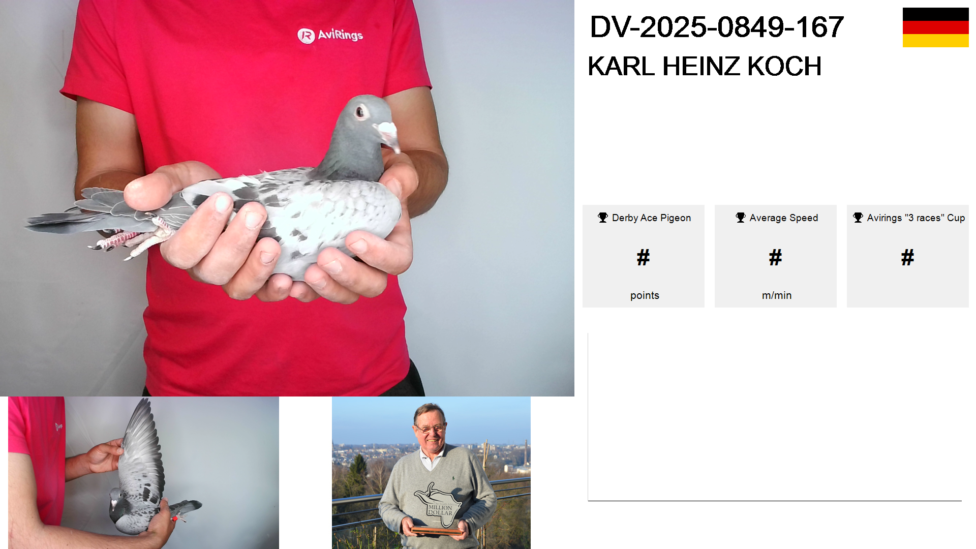 | Race | Position | Number of pigeons | Percent | Speed | Distance |