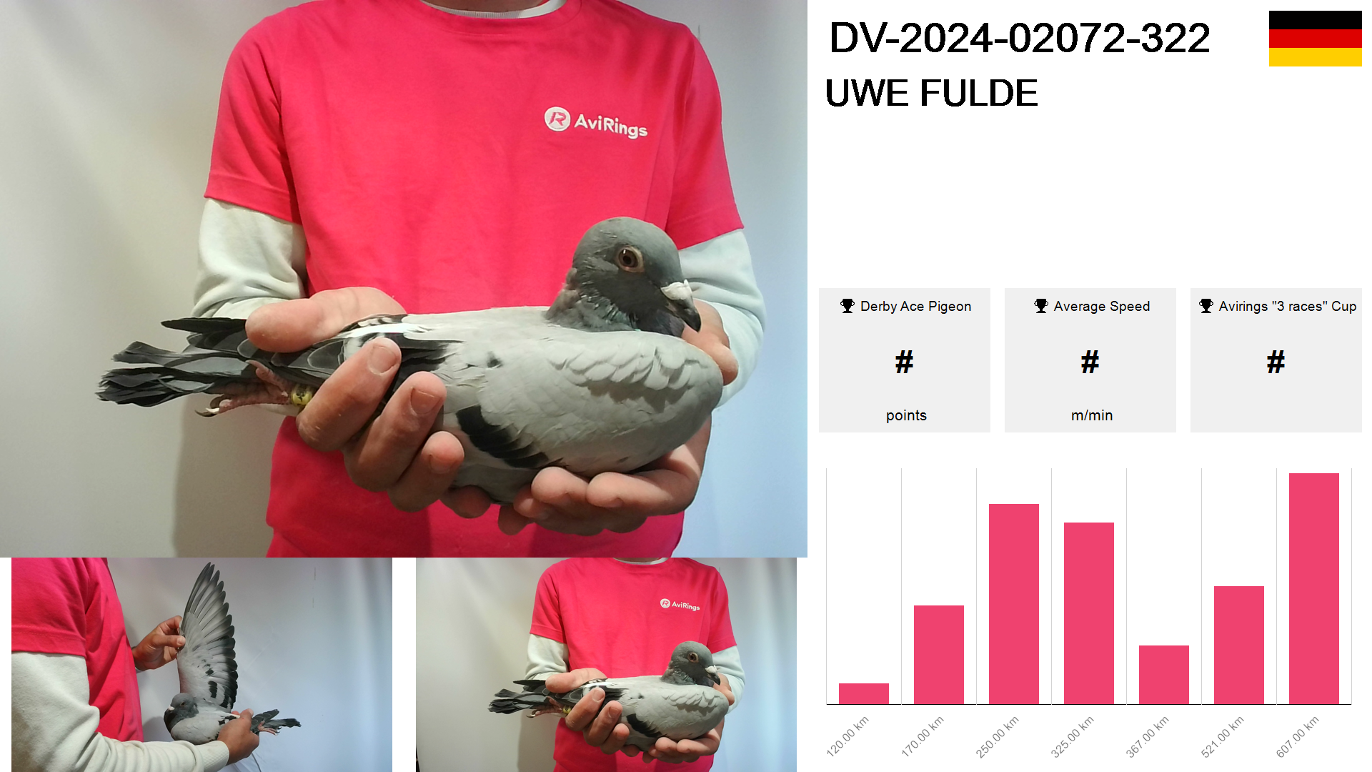 | Race | Position | Number of pigeons | Percent | Speed | Distance |