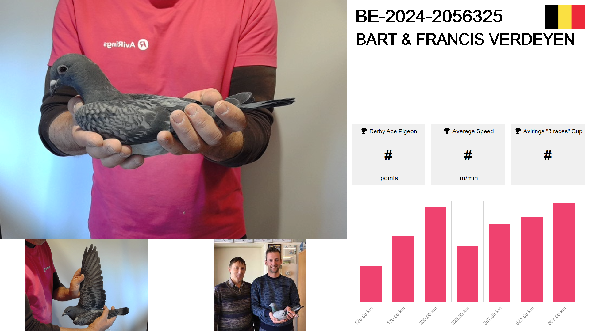 | Race | Position | Number of pigeons | Percent | Speed | Distance |