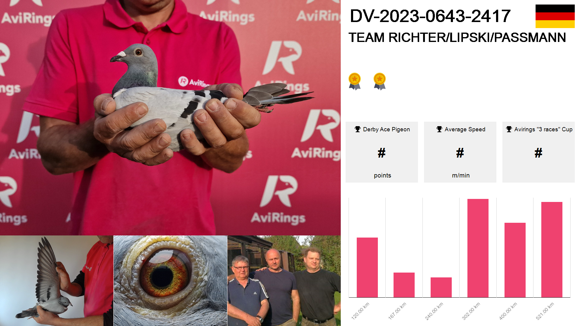 | Race | Position | Number of pigeons | Percent | Speed | Distance |