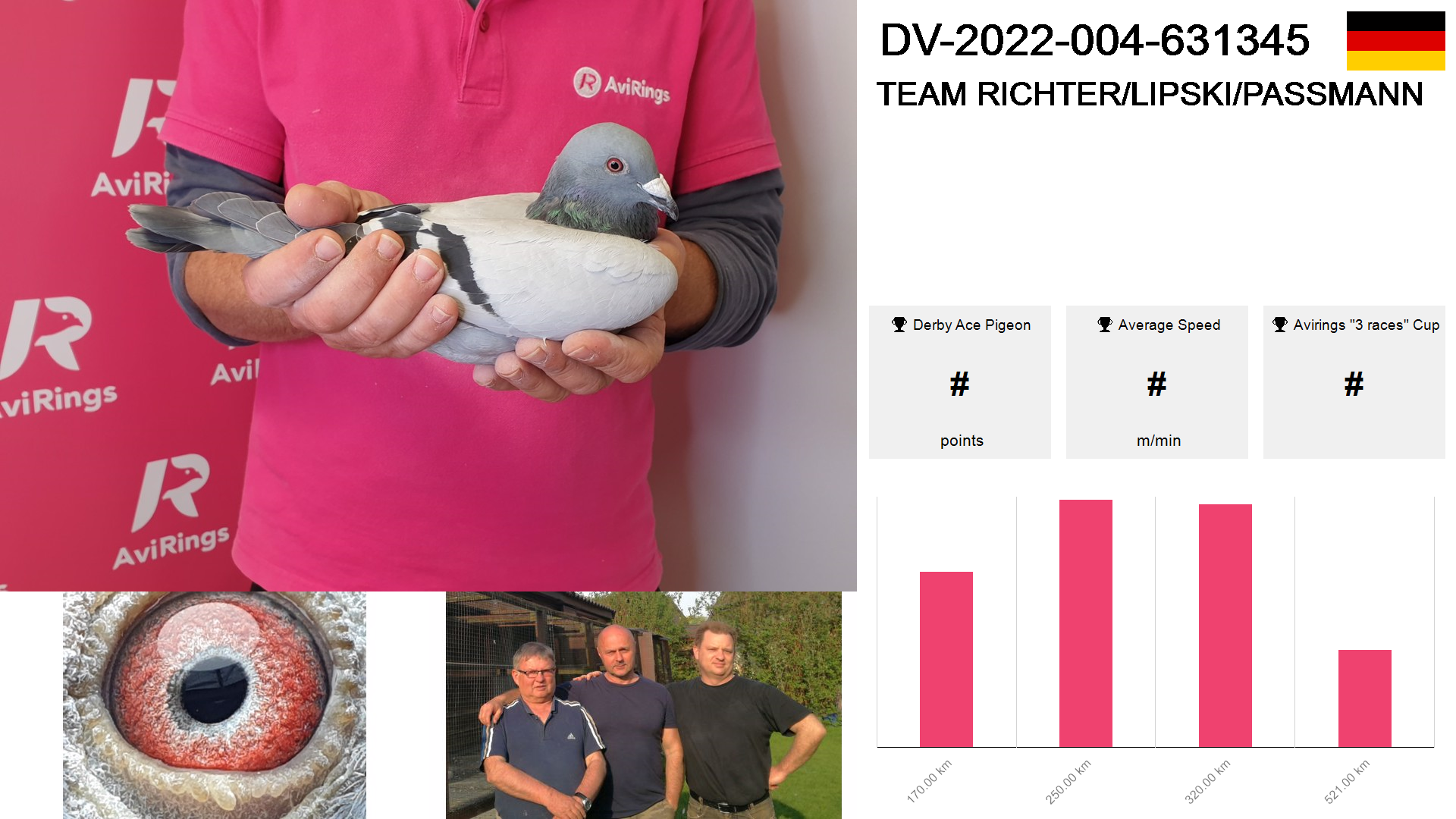 | Race | Position | Number of pigeons | Percent | Speed | Distance |