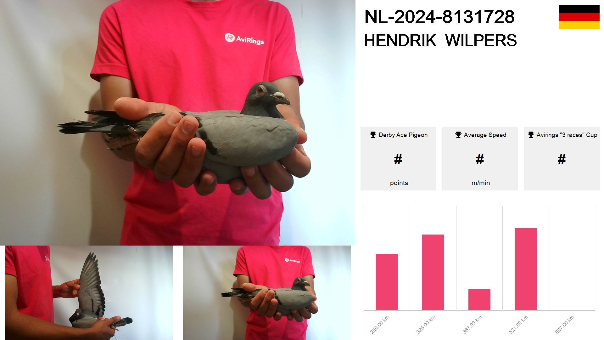 | Race | Position | Number of pigeons | Percent | Speed | Distance |