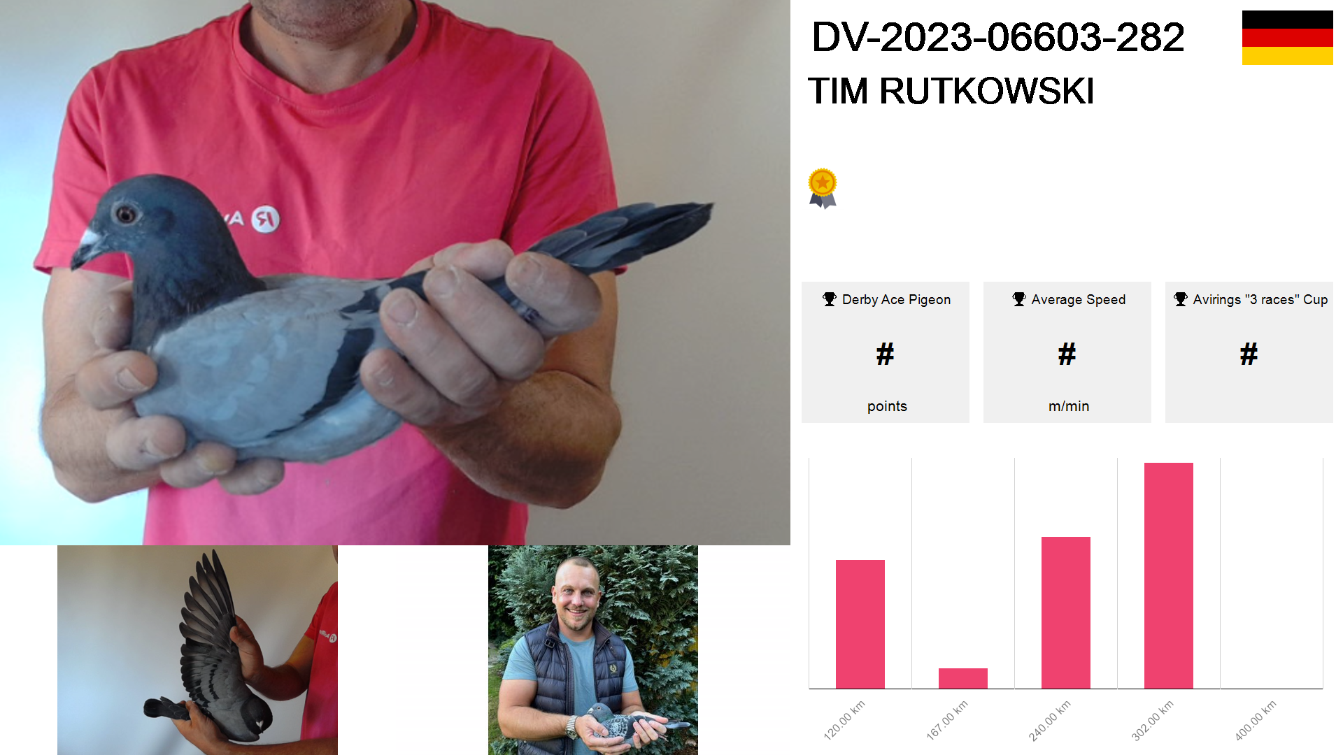 | Race | Position | Number of pigeons | Percent | Speed | Distance |