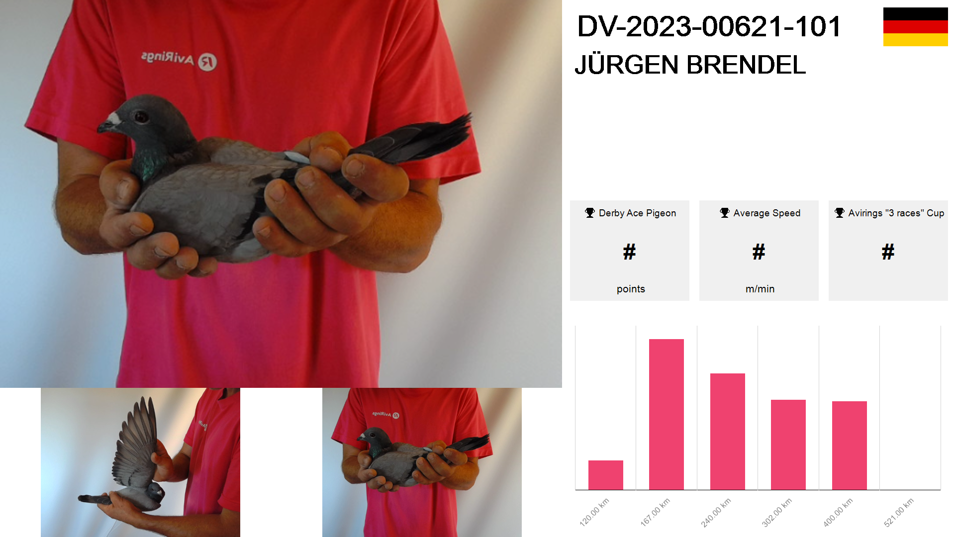 | Race | Position | Number of pigeons | Percent | Speed | Distance |