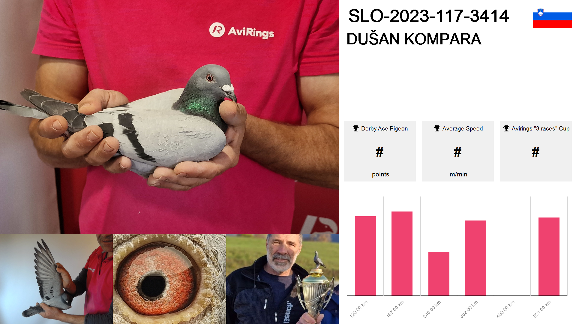 | Race | Position | Number of pigeons | Percent | Speed | Distance |