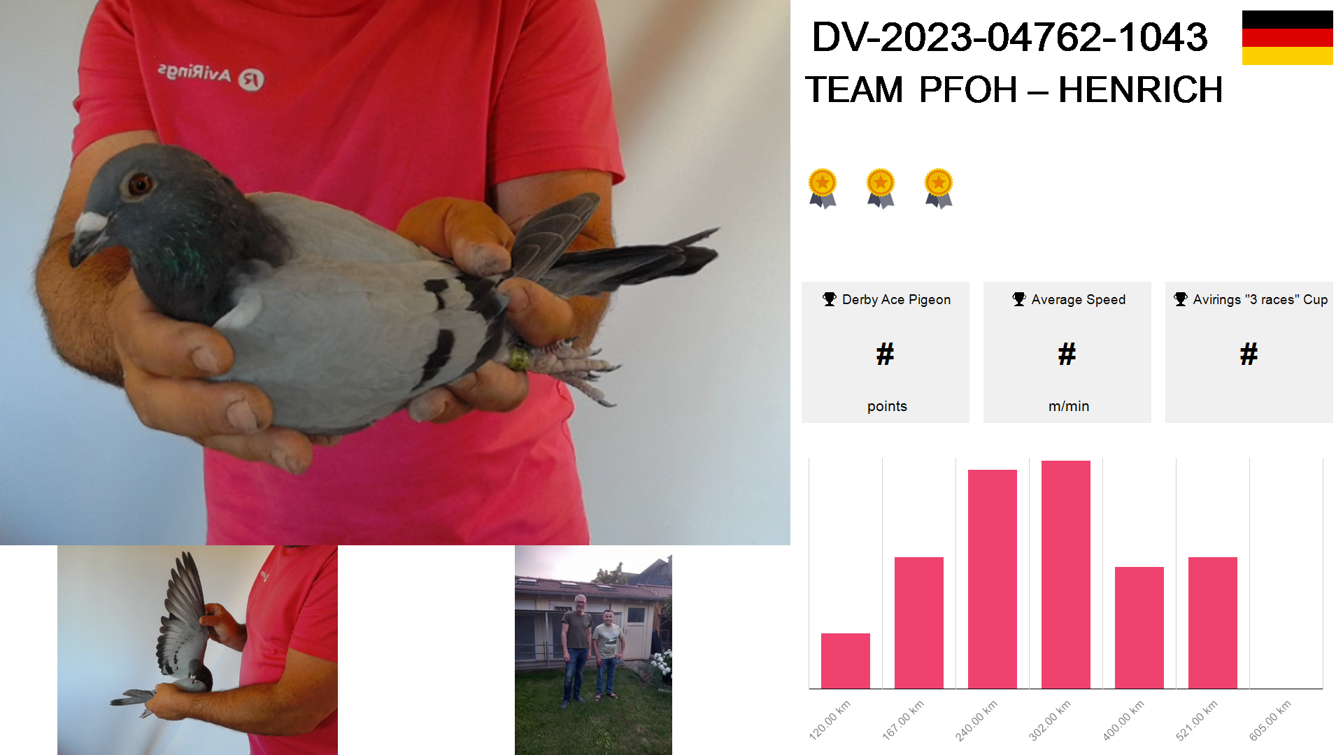 | Race | Position | Number of pigeons | Percent | Speed | Distance |
