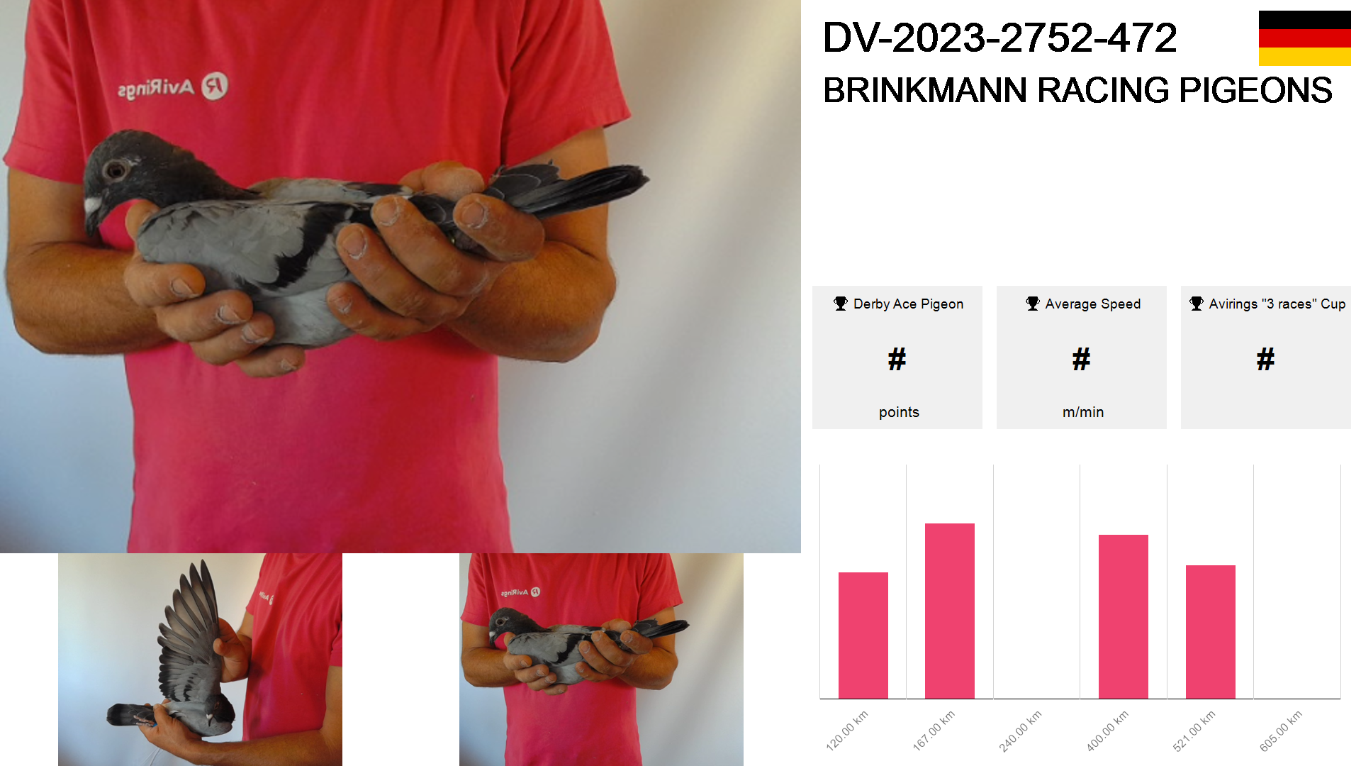 | Race | Position | Number of pigeons | Percent | Speed | Distance |