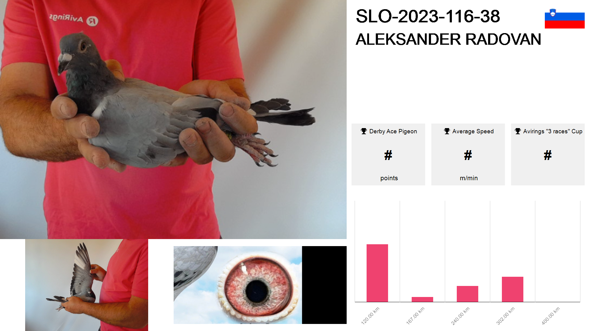 | Race | Position | Number of pigeons | Percent | Speed | Distance |