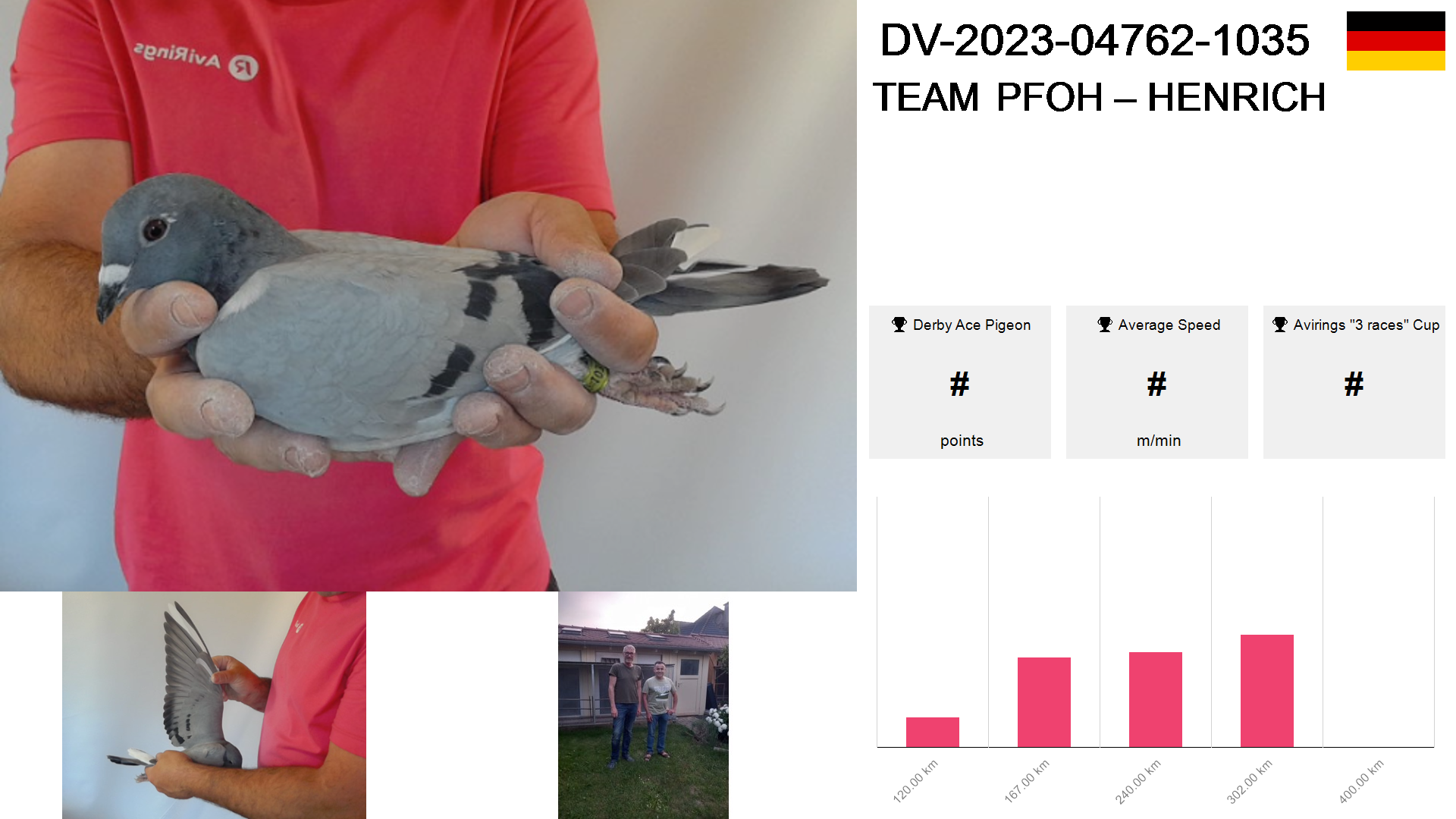 | Race | Position | Number of pigeons | Percent | Speed | Distance |
