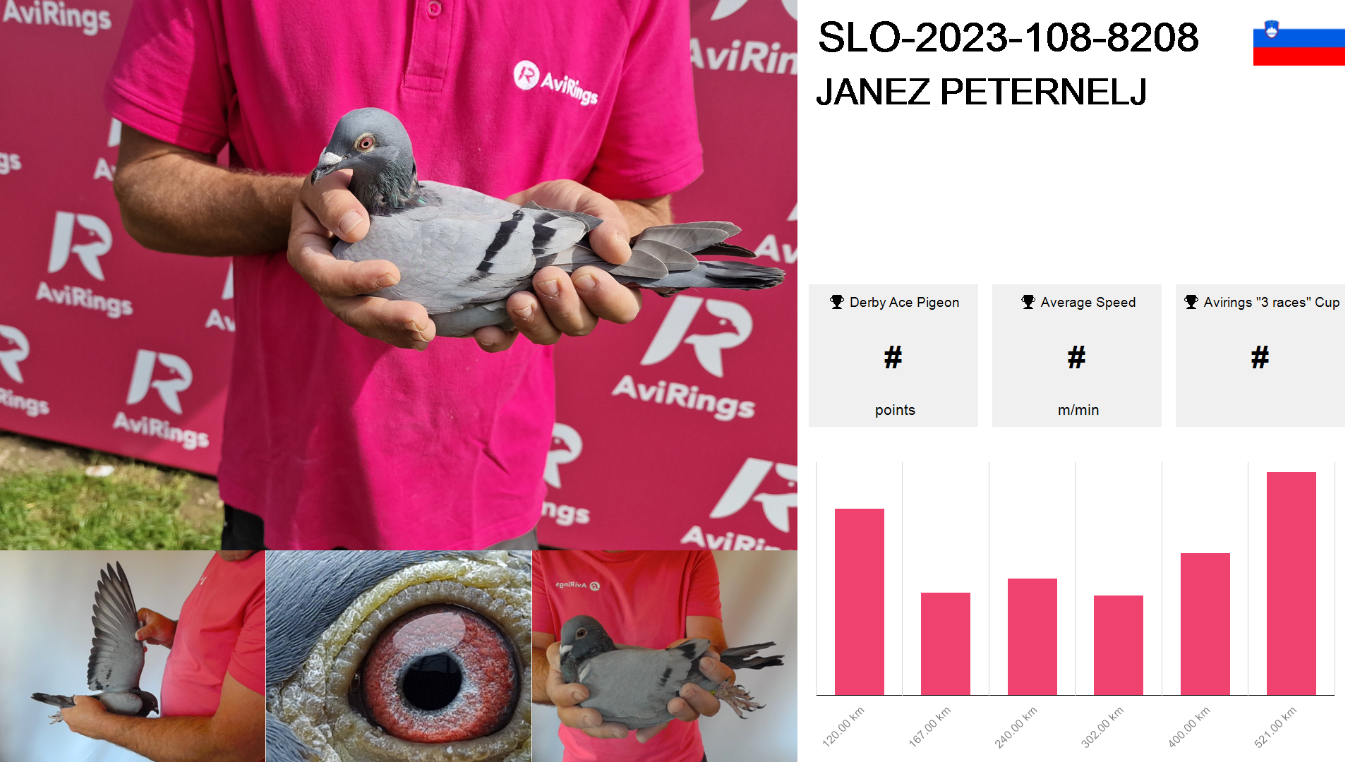 | Race | Position | Number of pigeons | Percent | Speed | Distance |