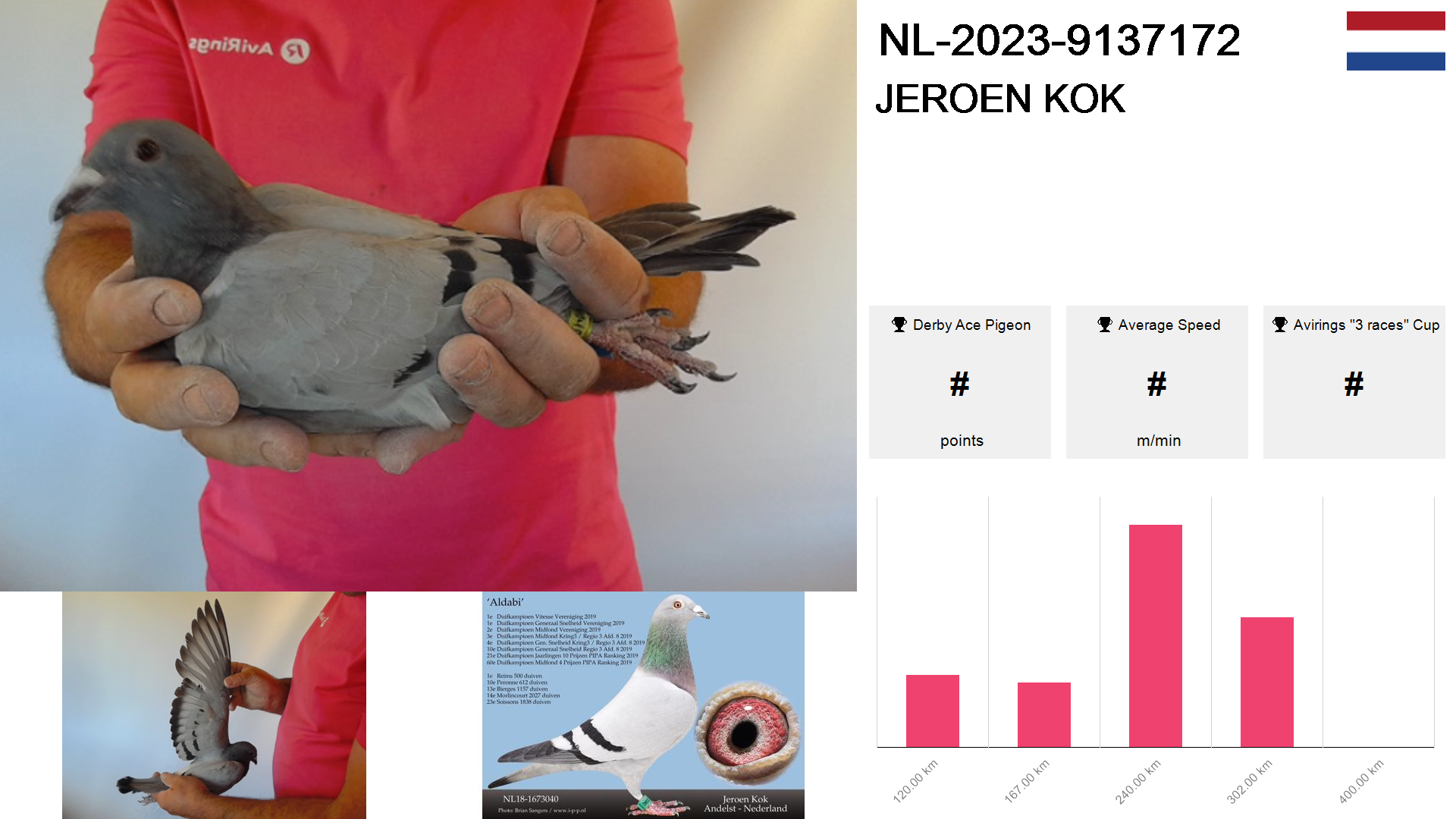 | Race | Position | Number of pigeons | Percent | Speed | Distance |