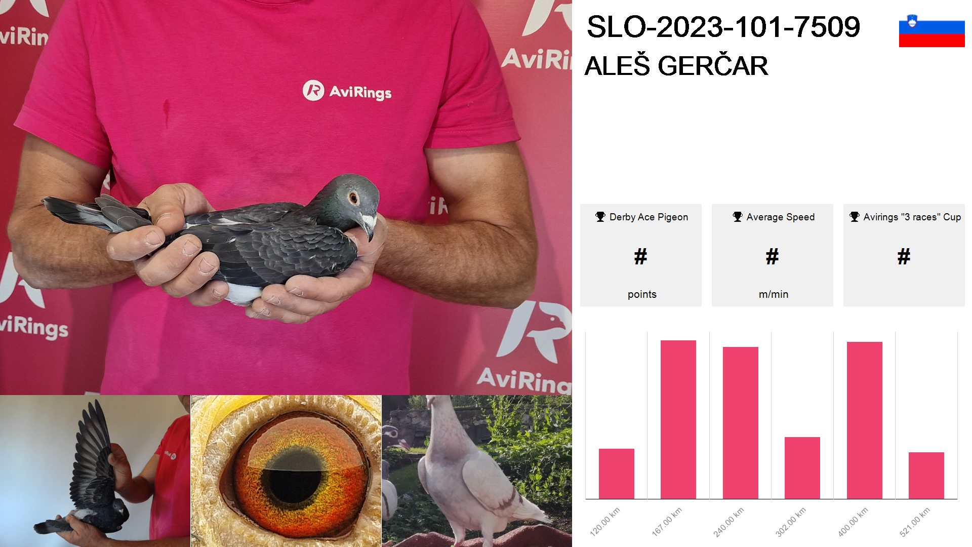 | Race | Position | Number of pigeons | Percent | Speed | Distance |