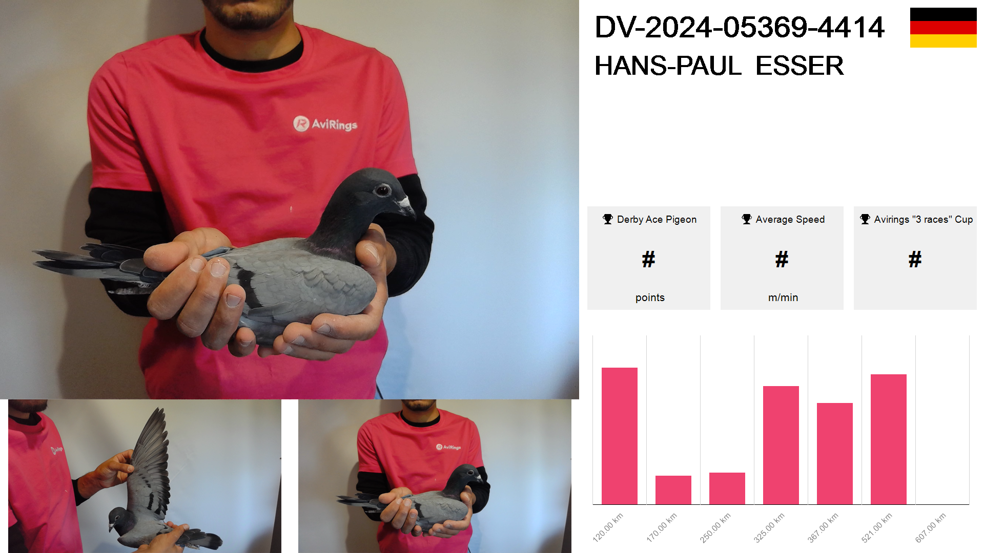 | Race | Position | Number of pigeons | Percent | Speed | Distance |