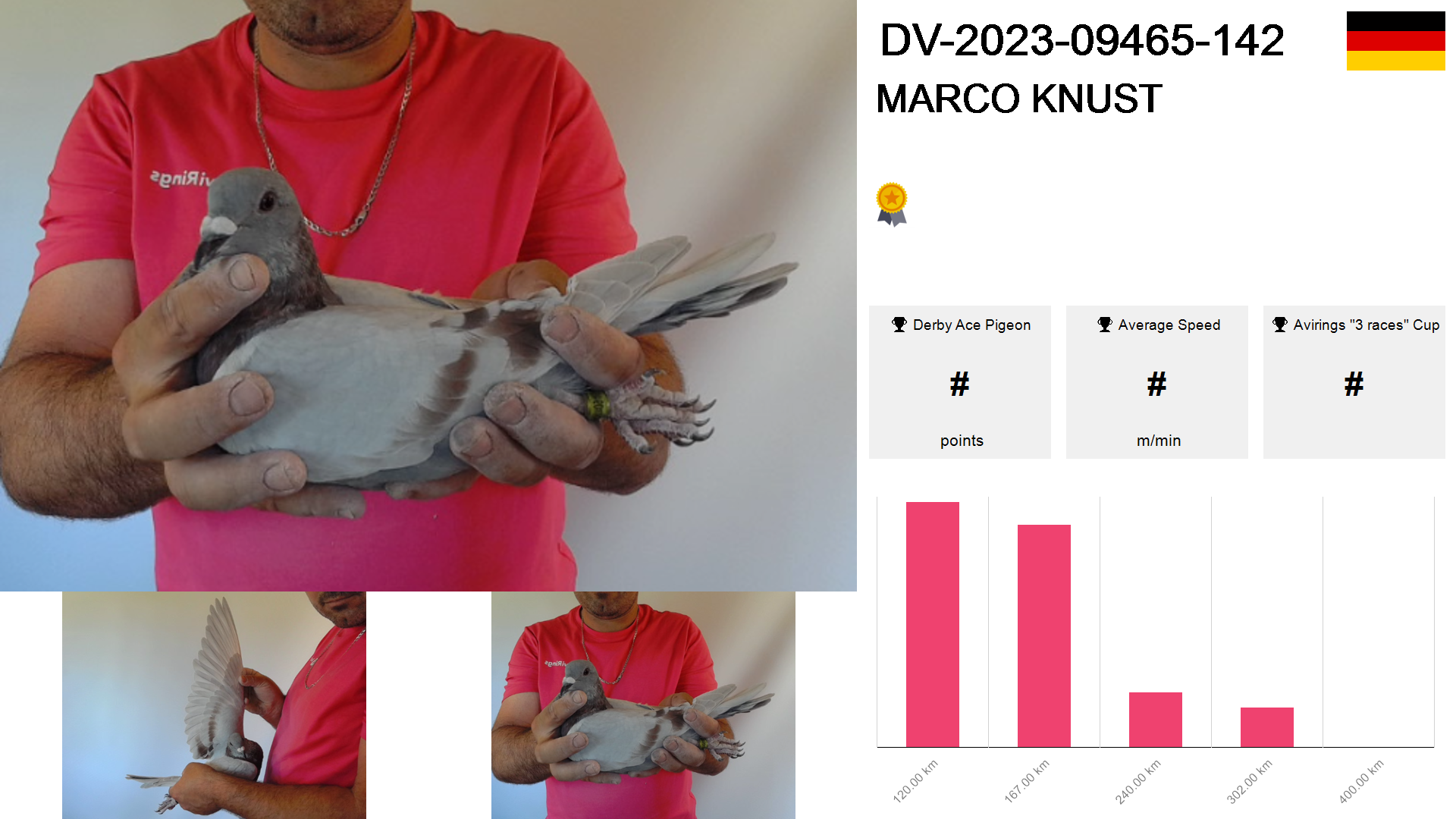 | Race | Position | Number of pigeons | Percent | Speed | Distance |