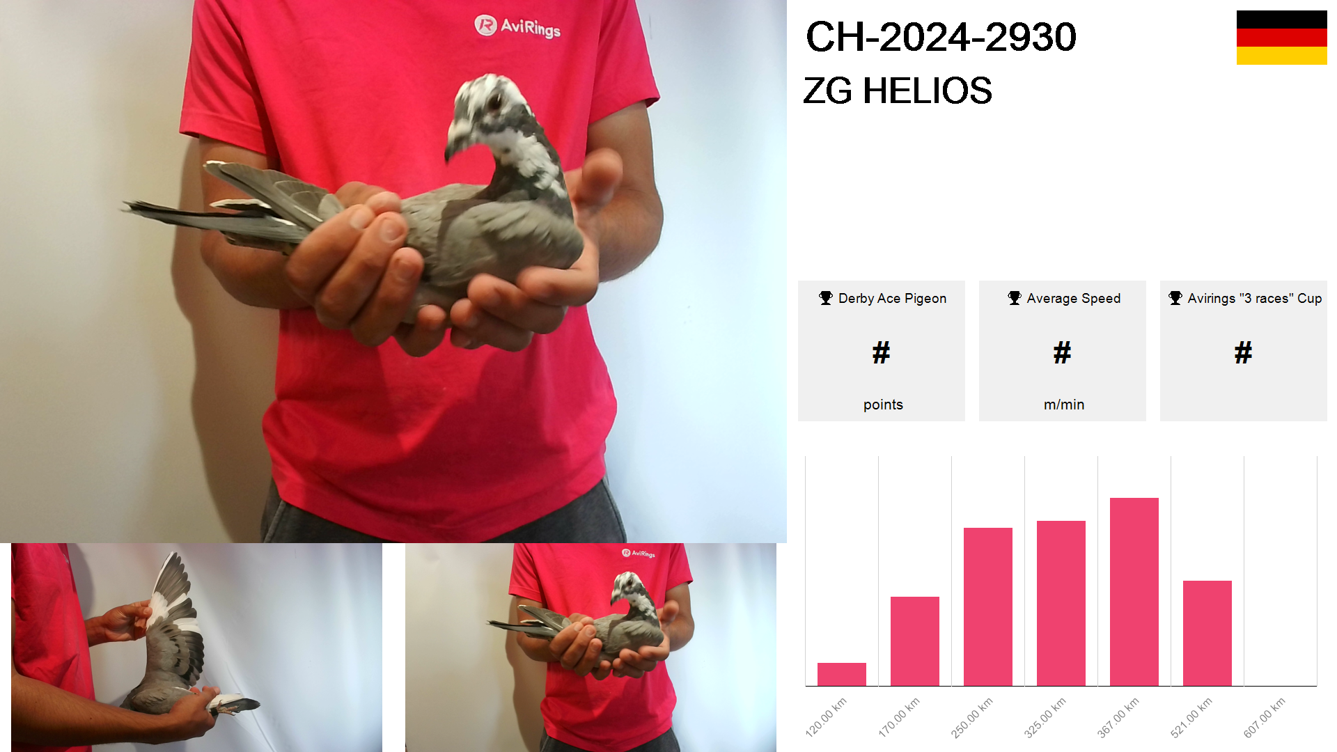 | Race | Position | Number of pigeons | Percent | Speed | Distance |