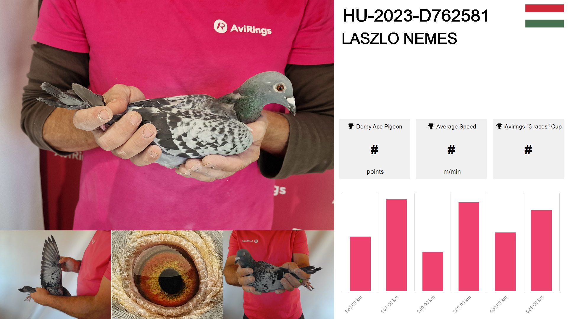 | Race | Position | Number of pigeons | Percent | Speed | Distance |