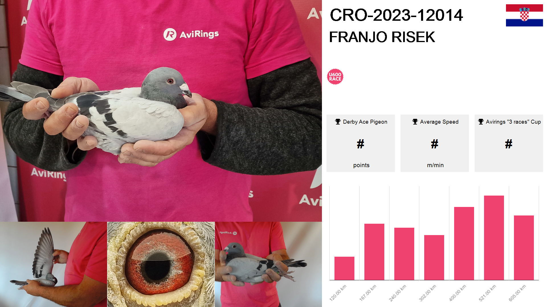 | Race | Position | Number of pigeons | Percent | Speed | Distance |