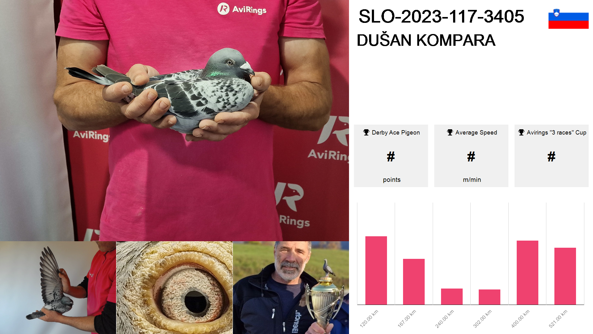 | Race | Position | Number of pigeons | Percent | Speed | Distance |