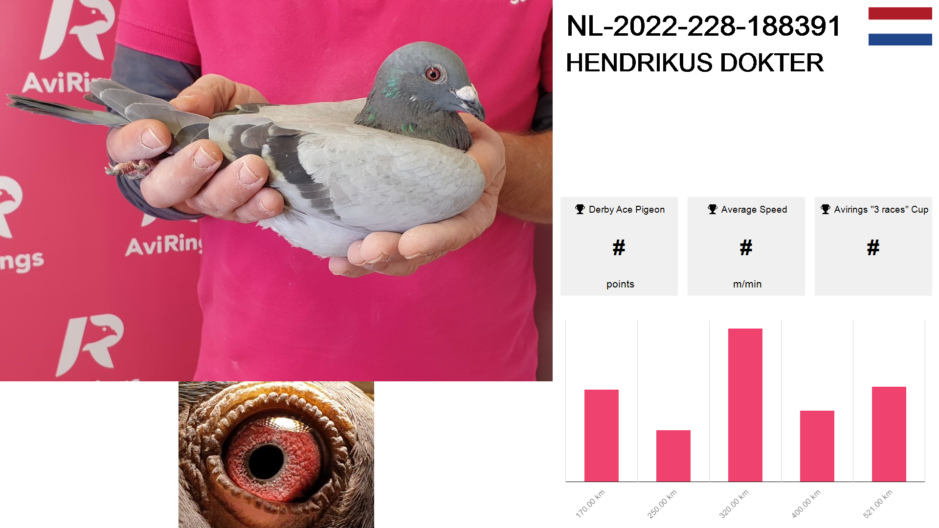 | Race | Position | Number of pigeons | Percent | Speed | Distance |