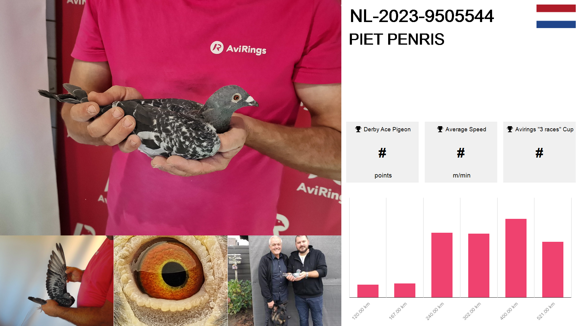 | Race | Position | Number of pigeons | Percent | Speed | Distance |