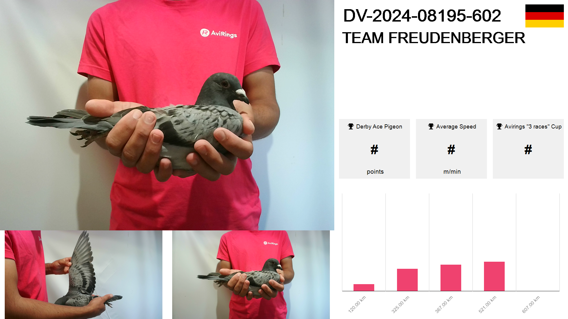 | Race | Position | Number of pigeons | Percent | Speed | Distance |