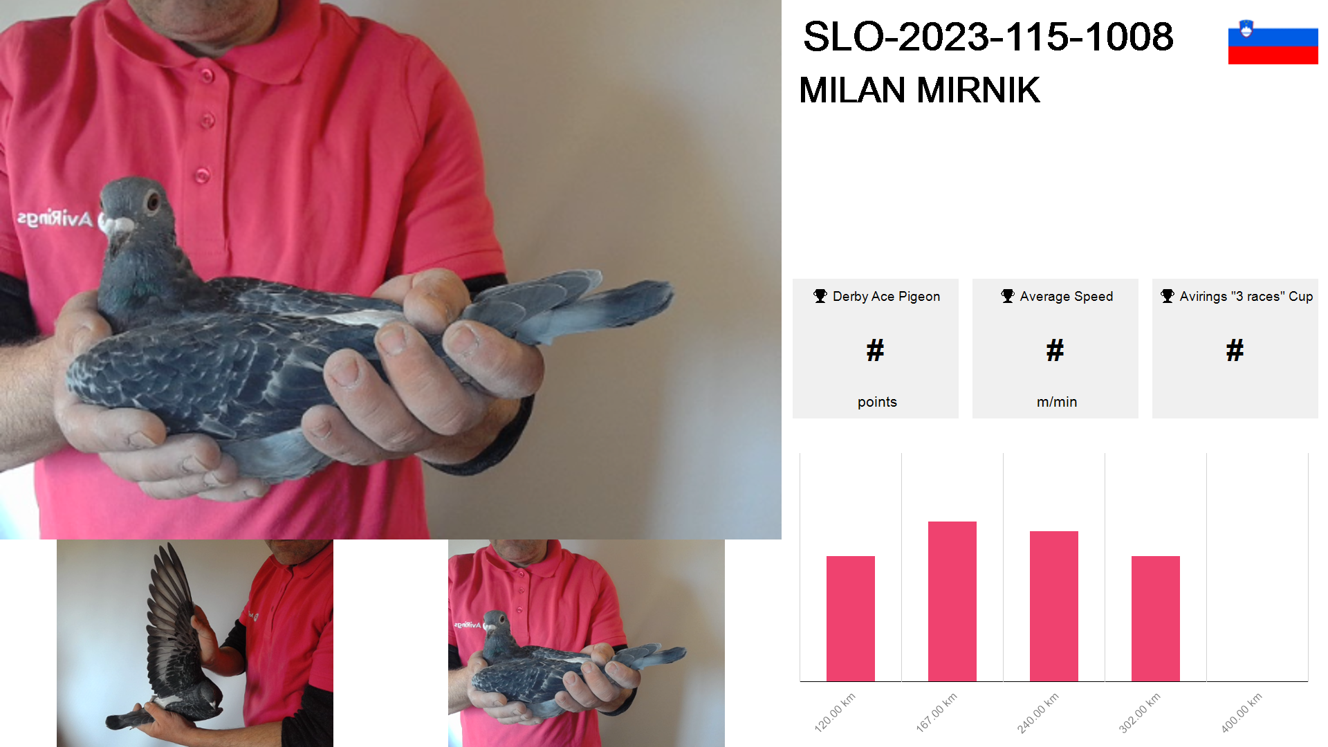 | Race | Position | Number of pigeons | Percent | Speed | Distance |