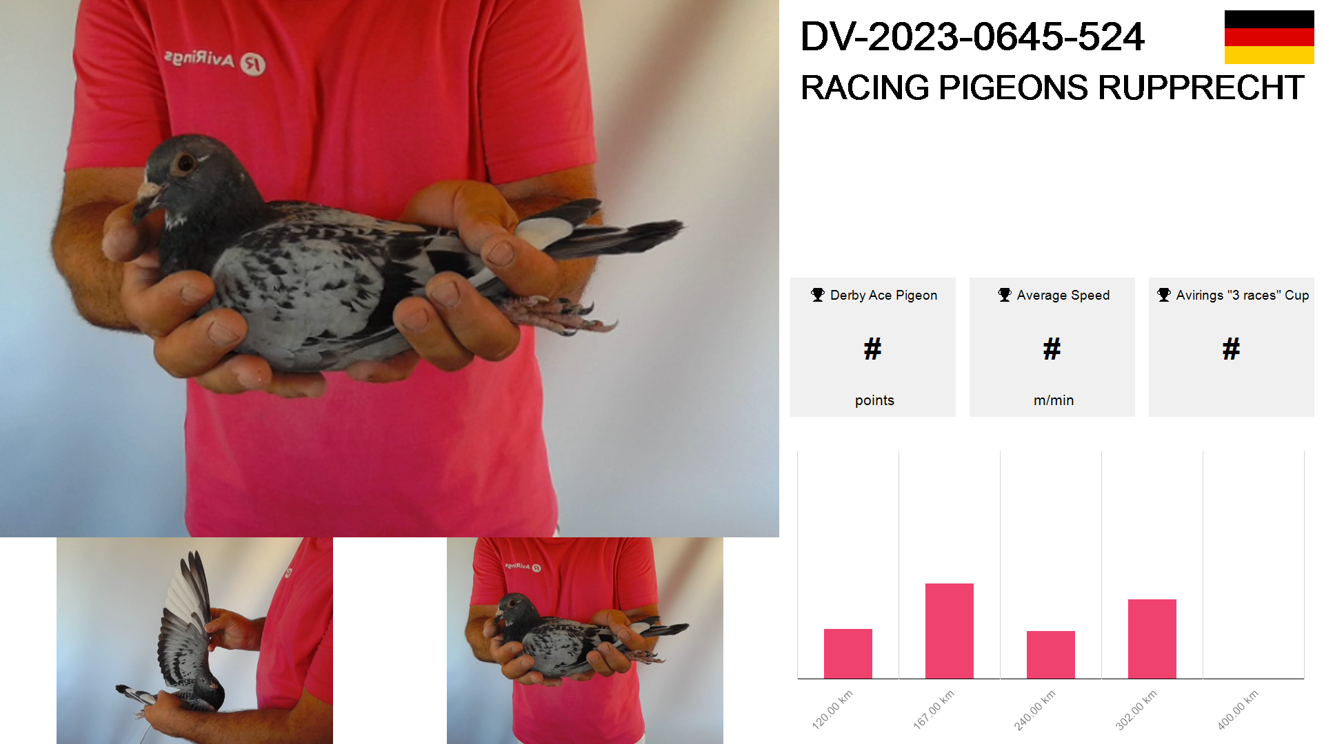 | Race | Position | Number of pigeons | Percent | Speed | Distance |
