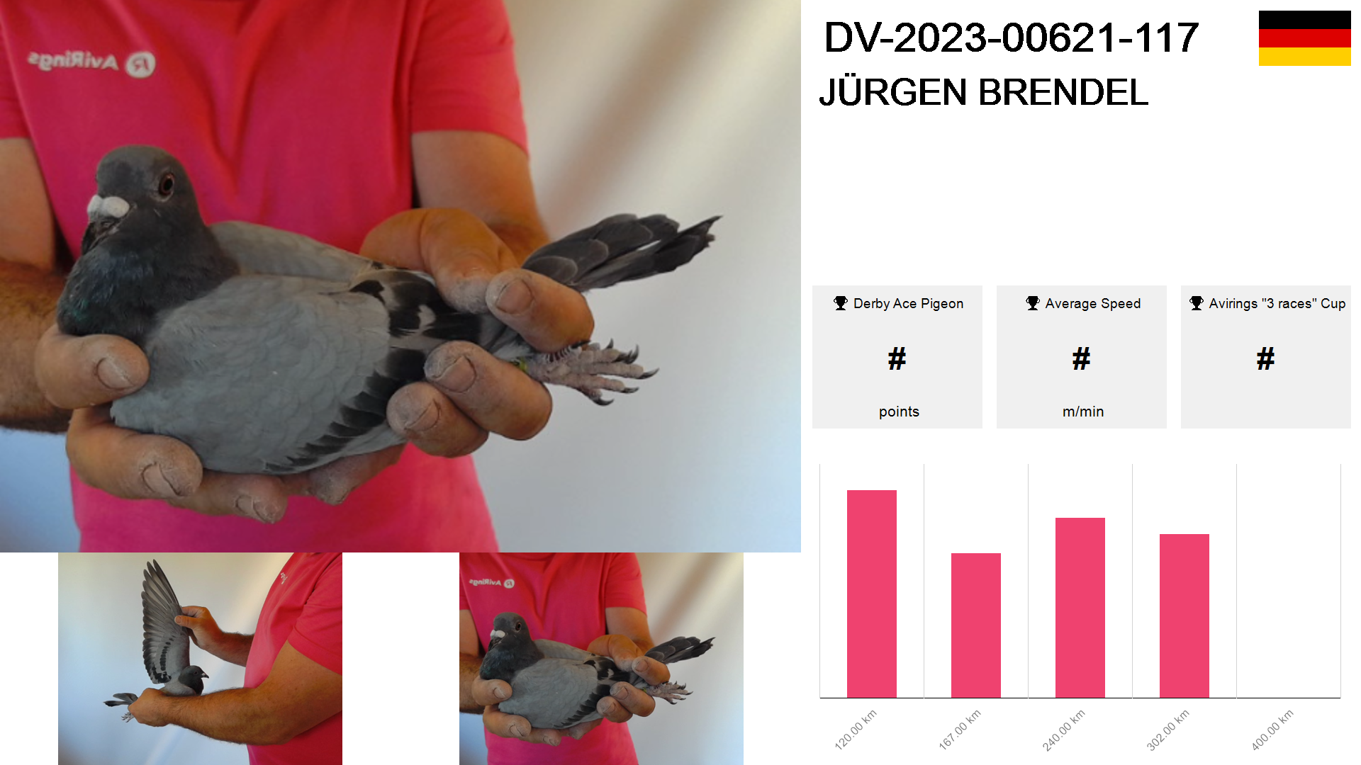 | Race | Position | Number of pigeons | Percent | Speed | Distance |