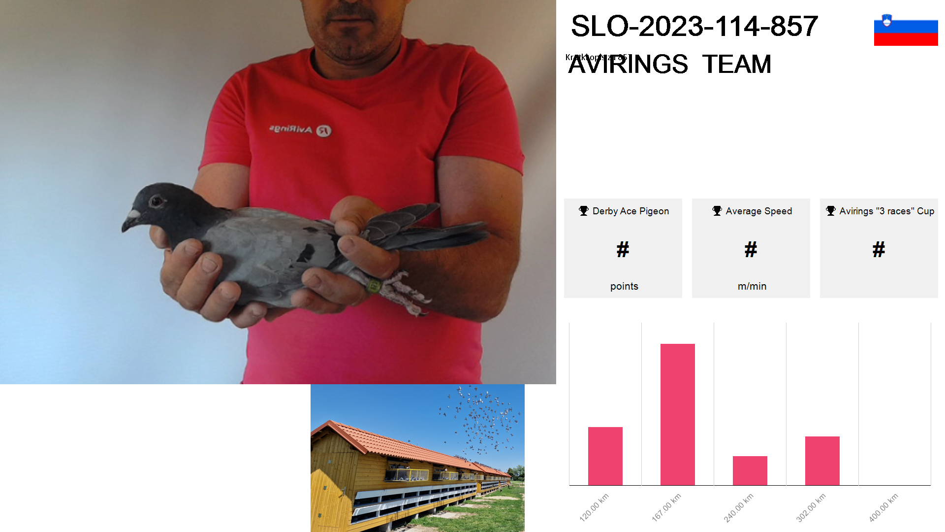 | Race | Position | Number of pigeons | Percent | Speed | Distance |
