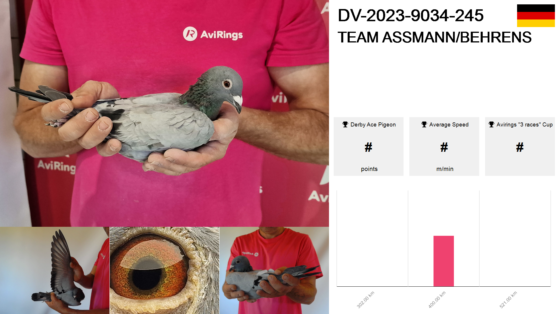 | Race | Position | Number of pigeons | Percent | Speed | Distance |