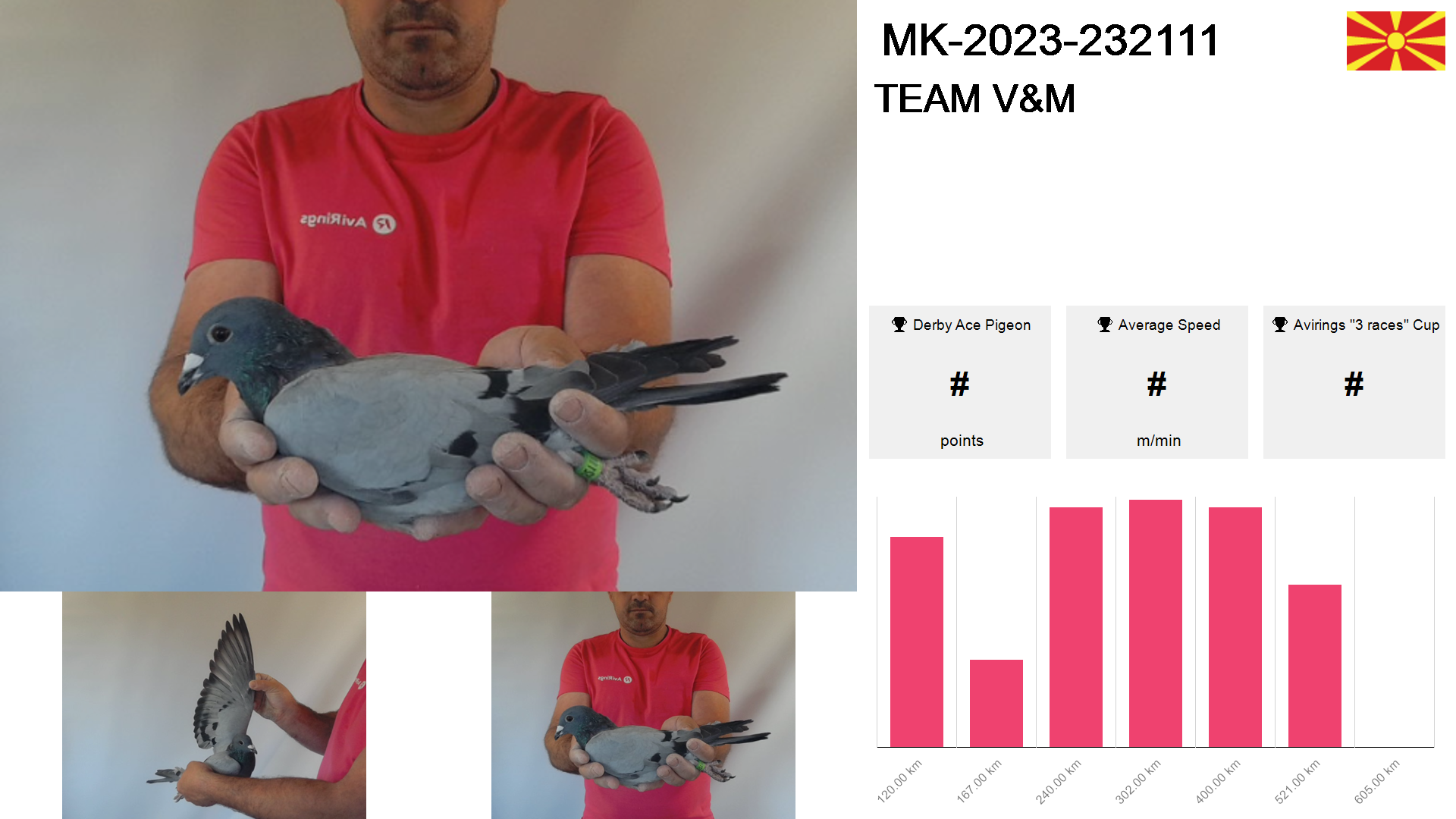 | Race | Position | Number of pigeons | Percent | Speed | Distance |