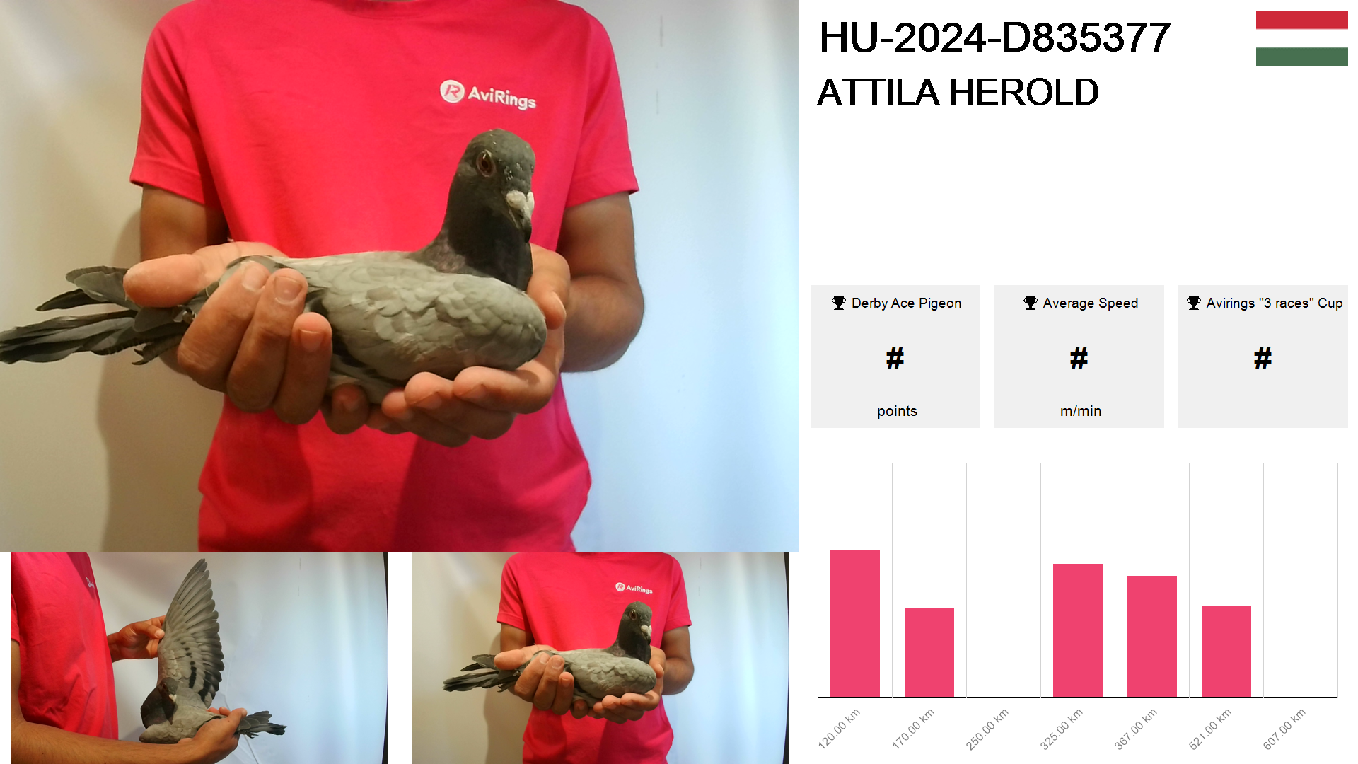| Race | Position | Number of pigeons | Percent | Speed | Distance |