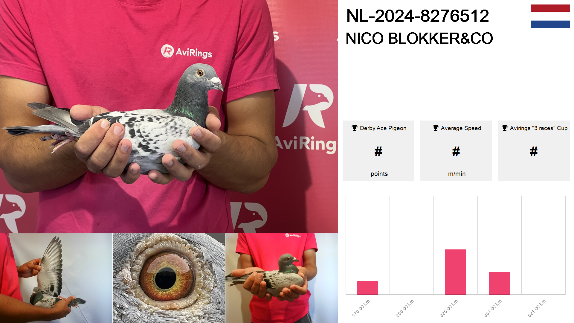 | Race | Position | Number of pigeons | Percent | Speed | Distance |