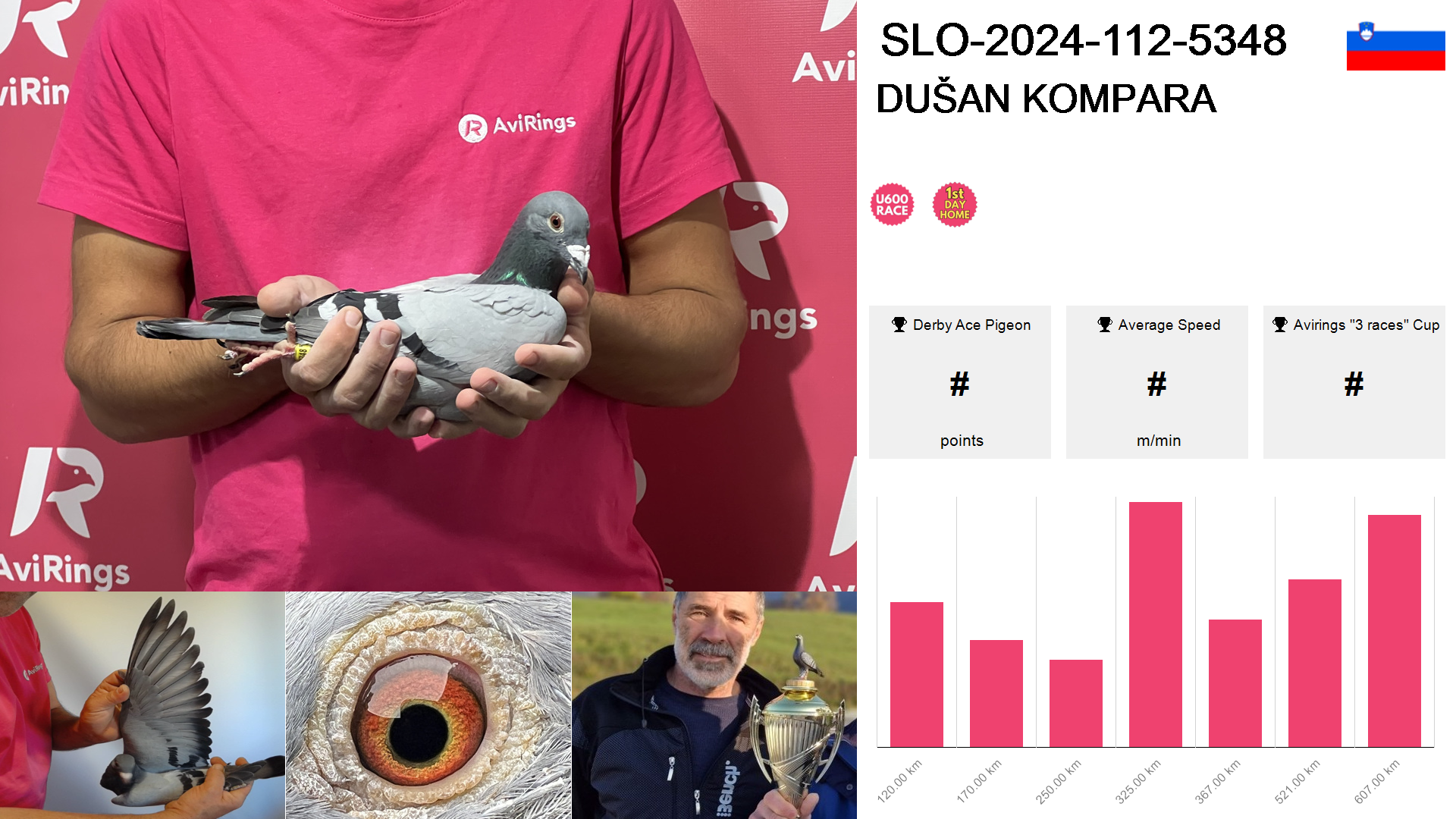 | Race | Position | Number of pigeons | Percent | Speed | Distance |