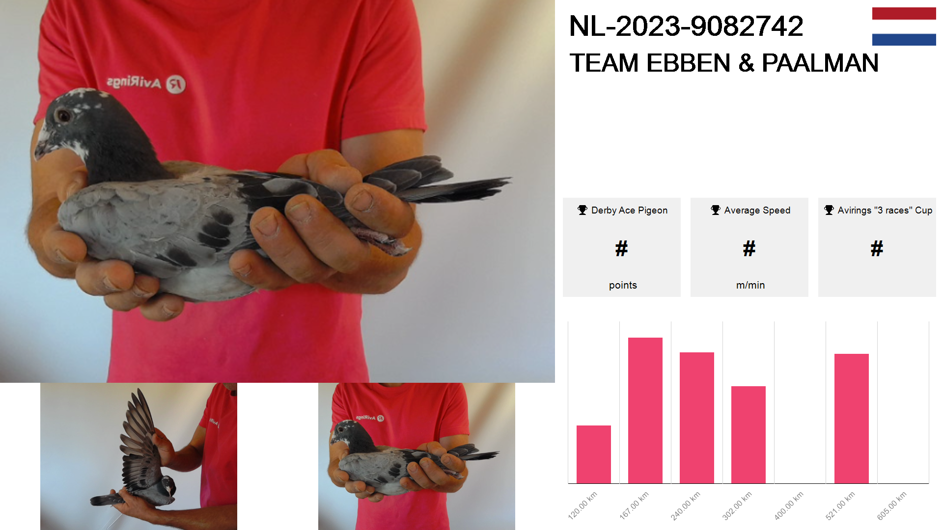 | Race | Position | Number of pigeons | Percent | Speed | Distance |